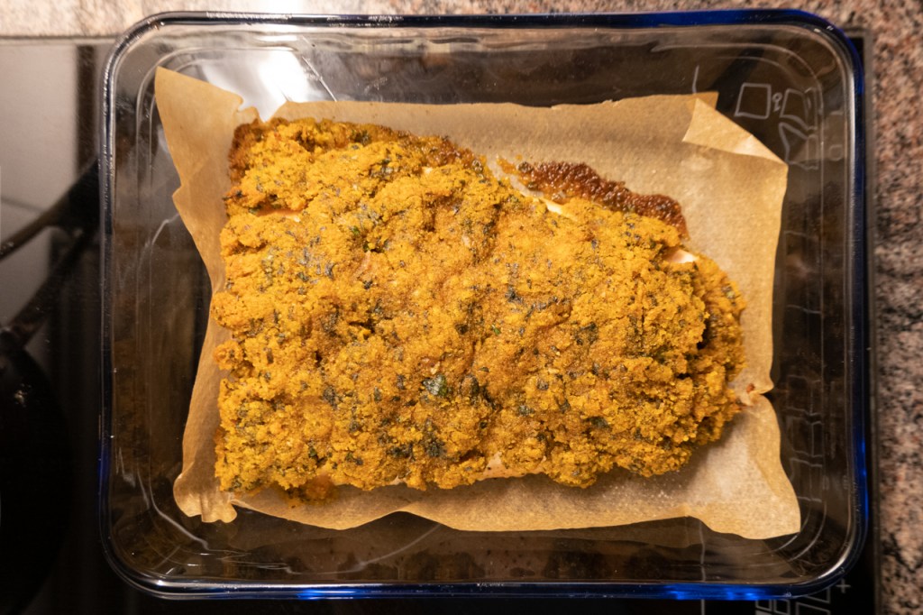 Bröselmischung auf dem Fisch verteilen.
