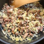 Zwiebeln und Speck zugeben, etwas mitbraten
