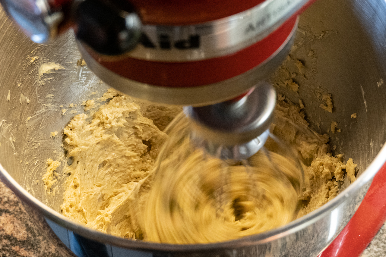 200 g weiche Butter mit 150 g braunem Zucker und 1 Beutel Vanillezucker schaumig schlagen, 1 Ei und 1/2 TL Salz zugeben, gut verrühren.