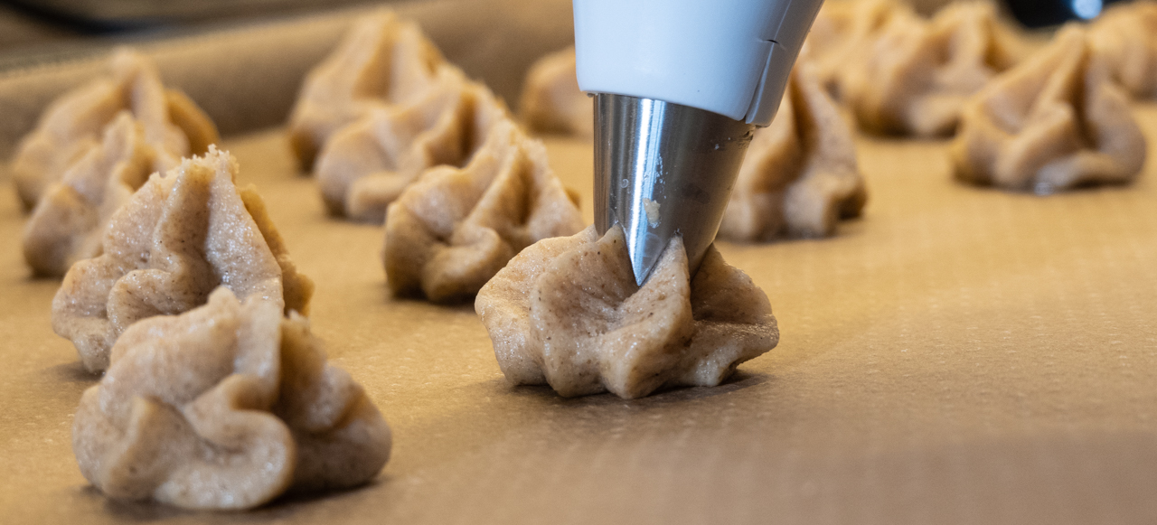Teig in einen Spritzbeutel füllen und auf ein mit Backpapier ausgelegtes Backblech spritzen. Dabei genügend Abstand halten, die Plätzchen verlaufen sehr.