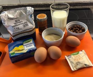 200 g Weizen- oder Dinkelvollkornmehl mit 50 g gemahlenen Haselnüssen, 1 TL Backpulver, 1 Prise Salz, 1/2 TL Zimtpulver und 2 Msp. Gewürznelkenpulver vermischen. Mehlmischung nach und nach unter die Eier-Butter-Mischung rühren.