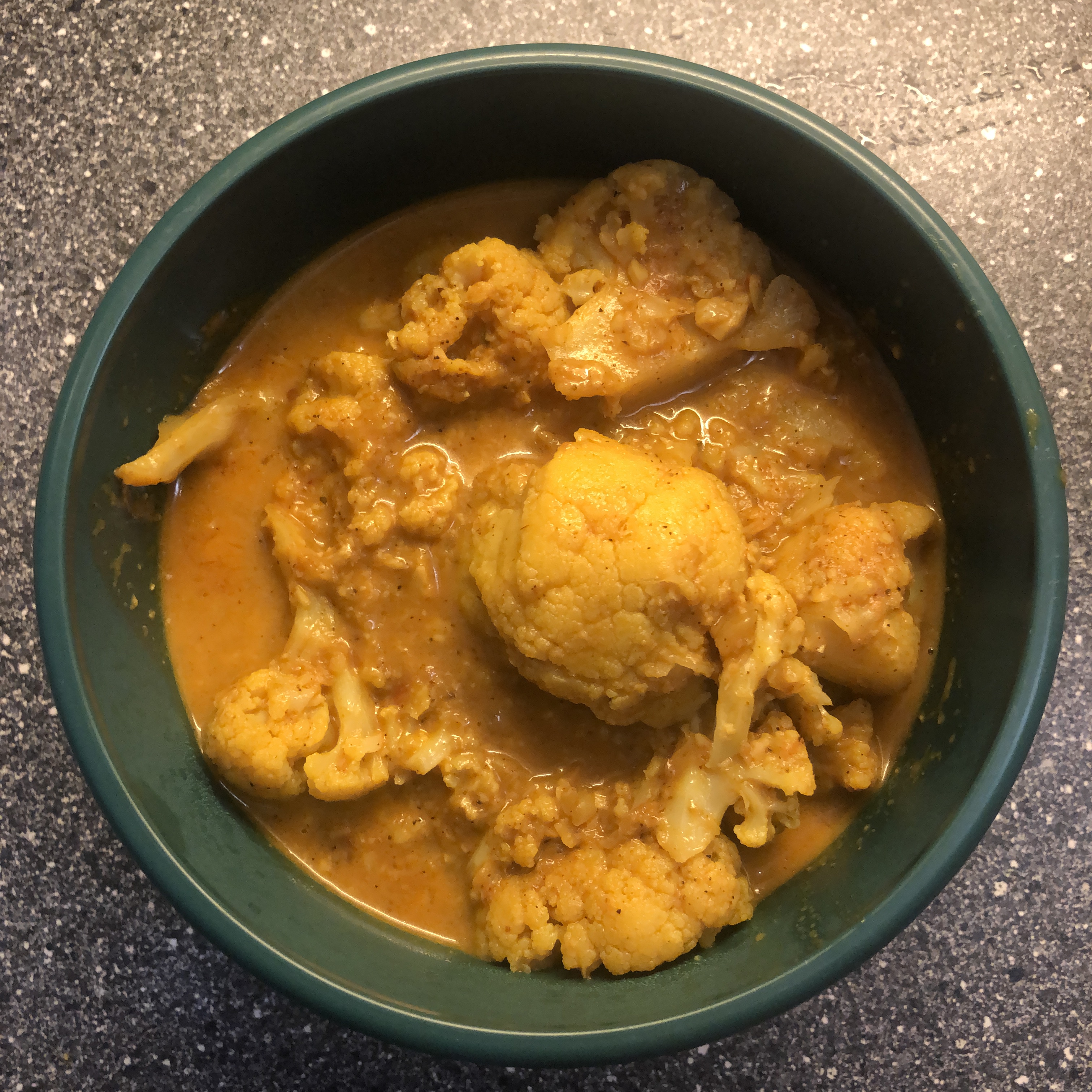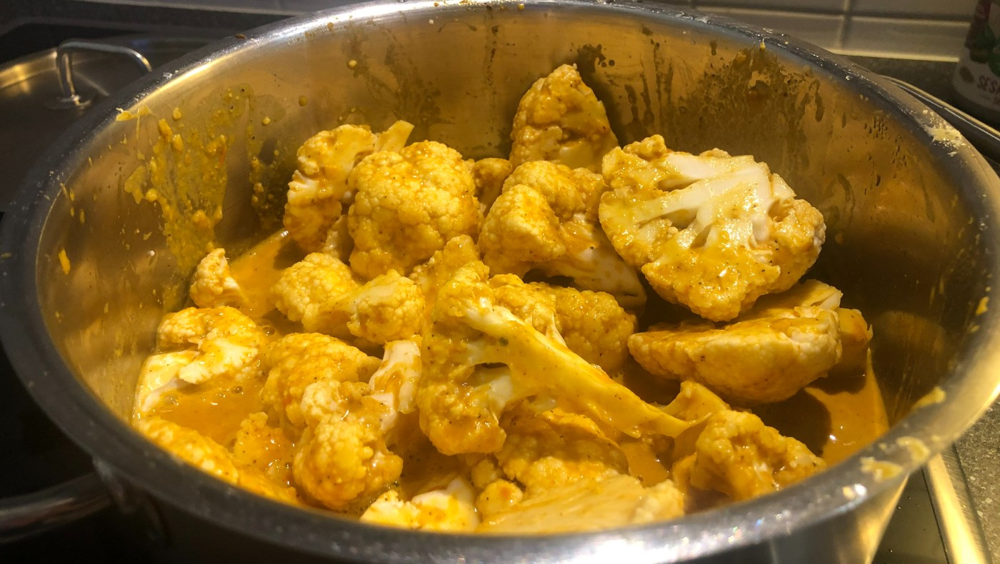 1 Blumenkohl in Röschen teilen, und in die Sauce geben. 15 Minuten kochen, bis der Blumenkohl gar und die Sauce etwas eingedickt ist.