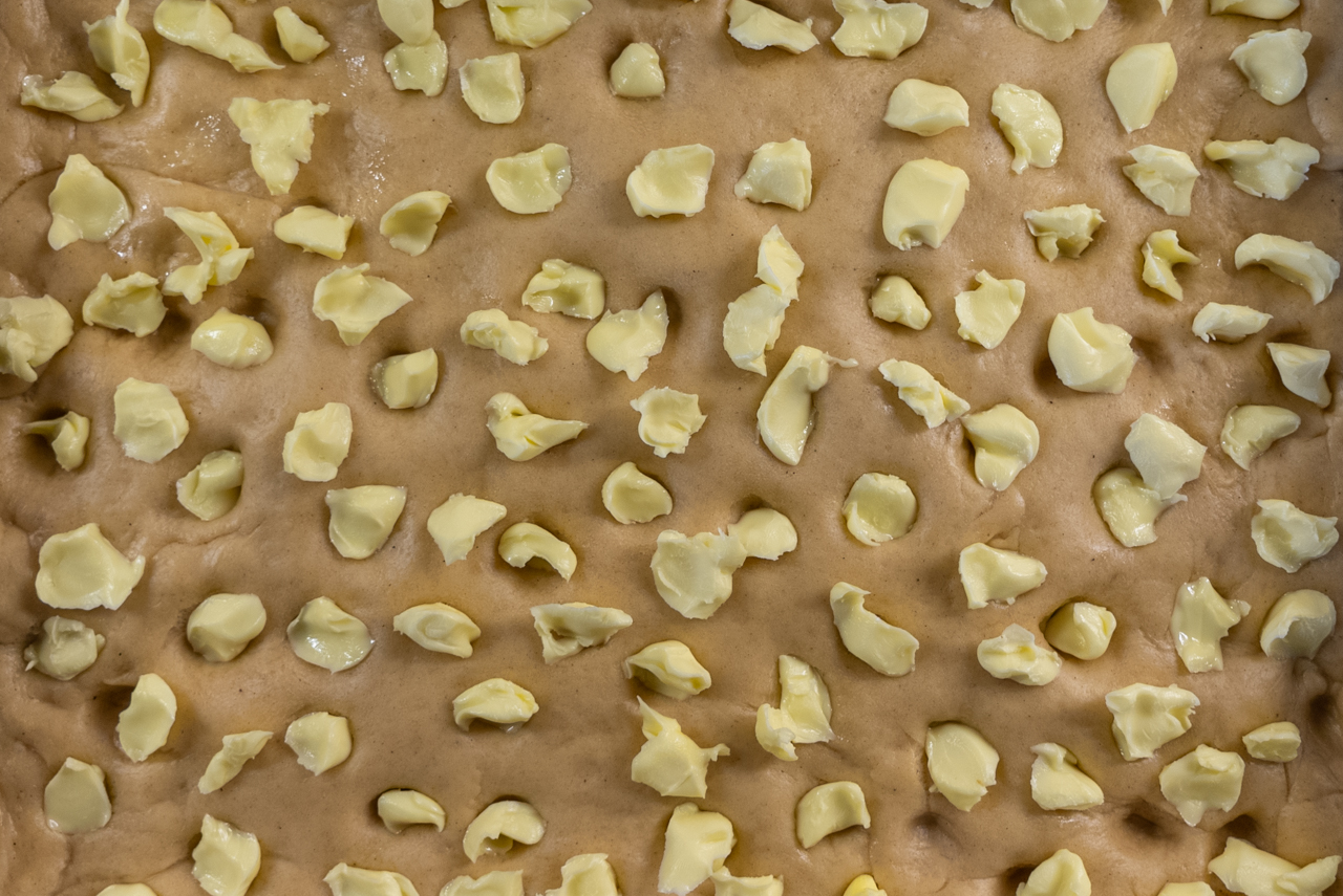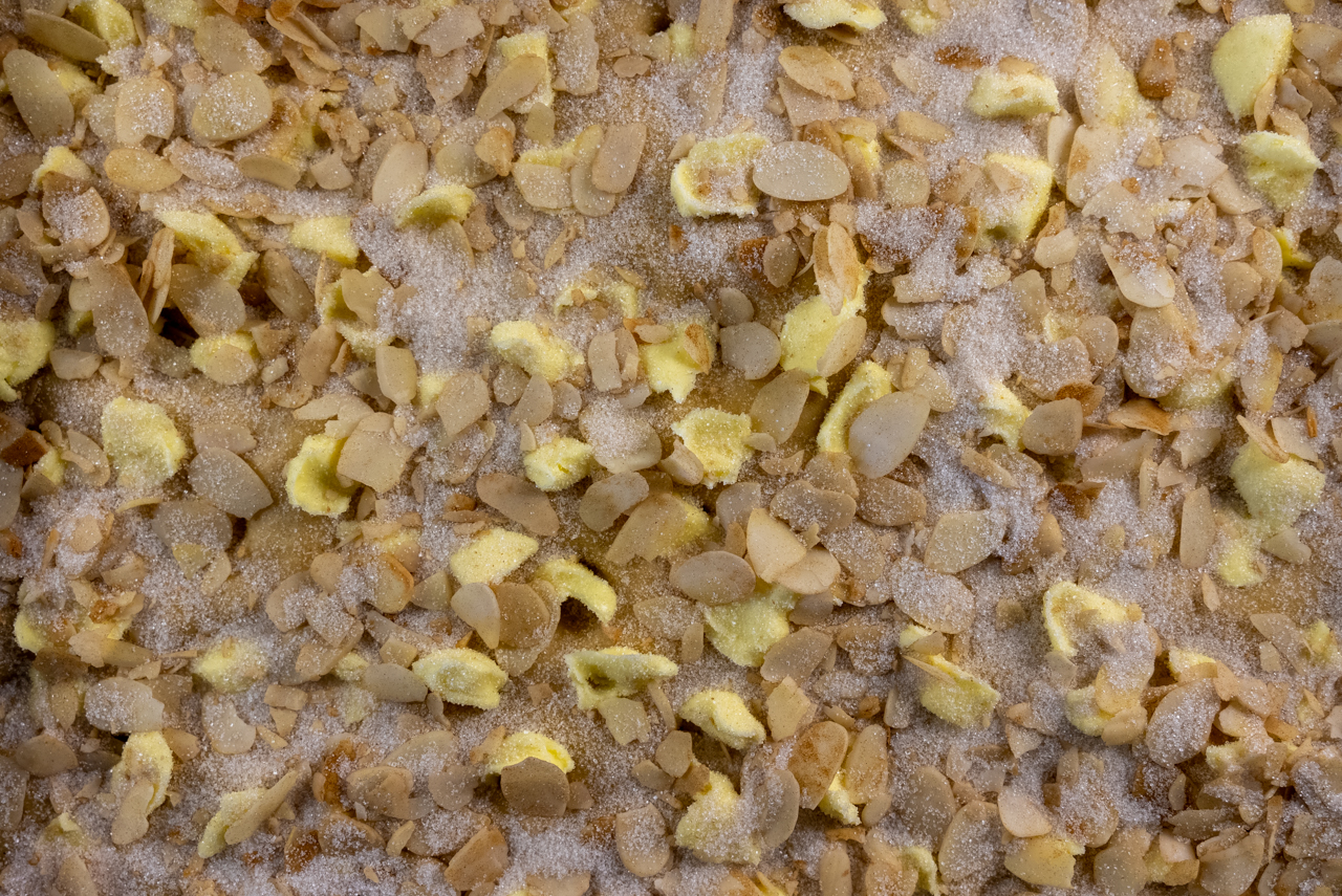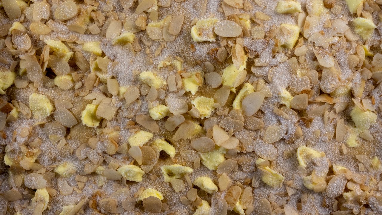 Mit den Fingern kleine Mulden in den Teig drücken. 150 g Butter in kleine Würfel schneiden und in die Löcher drücken. Kuchen mit 100 g Zimtzucker und 100 g Mandelblättchen bestreuen und sofort im vorgeheizten Ofen 25 Minuten goldbraun backen. Am besten lauwarm servieren.