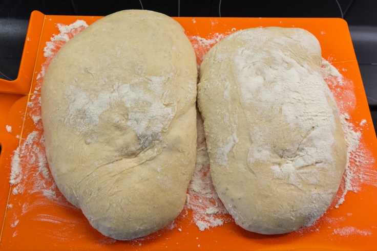 Den Teig auf die bemehlte Arbeitsfläche geben und zwei rechteckige Stücke abstechen. Ins gut bemehlte Leinentuch setzen und insgesamt 2 Stunden zugedeckt bei Raumtemperatur reifen lassen. Nach einer Stunde die Teiglinge leicht mit den Fingerspitzen eindrücken, damit sich das Gas unregelmäßig verteilt.