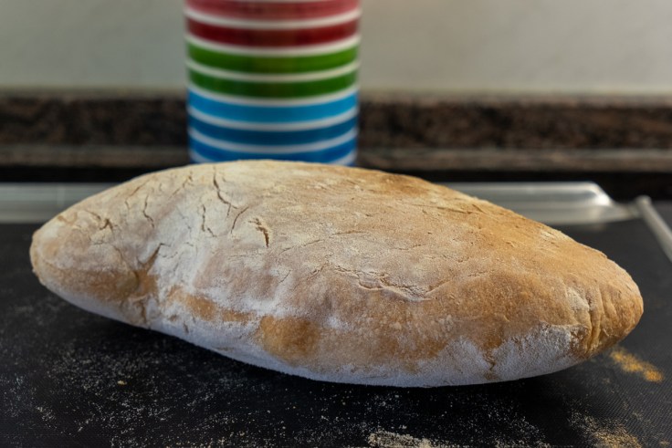 Für den Hauptteig den Vorteig, 340 g Weizenmehl (Typ 550), 240 g Wasser (22 Grad), 8 g Salz, 3 g Frischhefe und 16 g Olivenöl 5 Minuten auf niedrigster Stufe und weitere 13-15 Minuten auf zweiter Stufe in der Küchenmaschine zu enem glatten und elastischen Teig kneten (Teigtemperatur ca. 26 Grad).