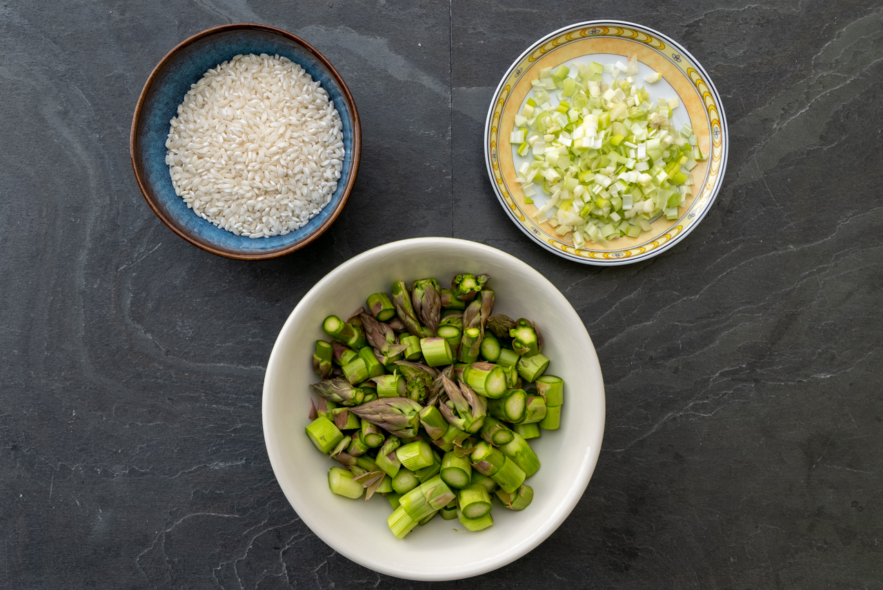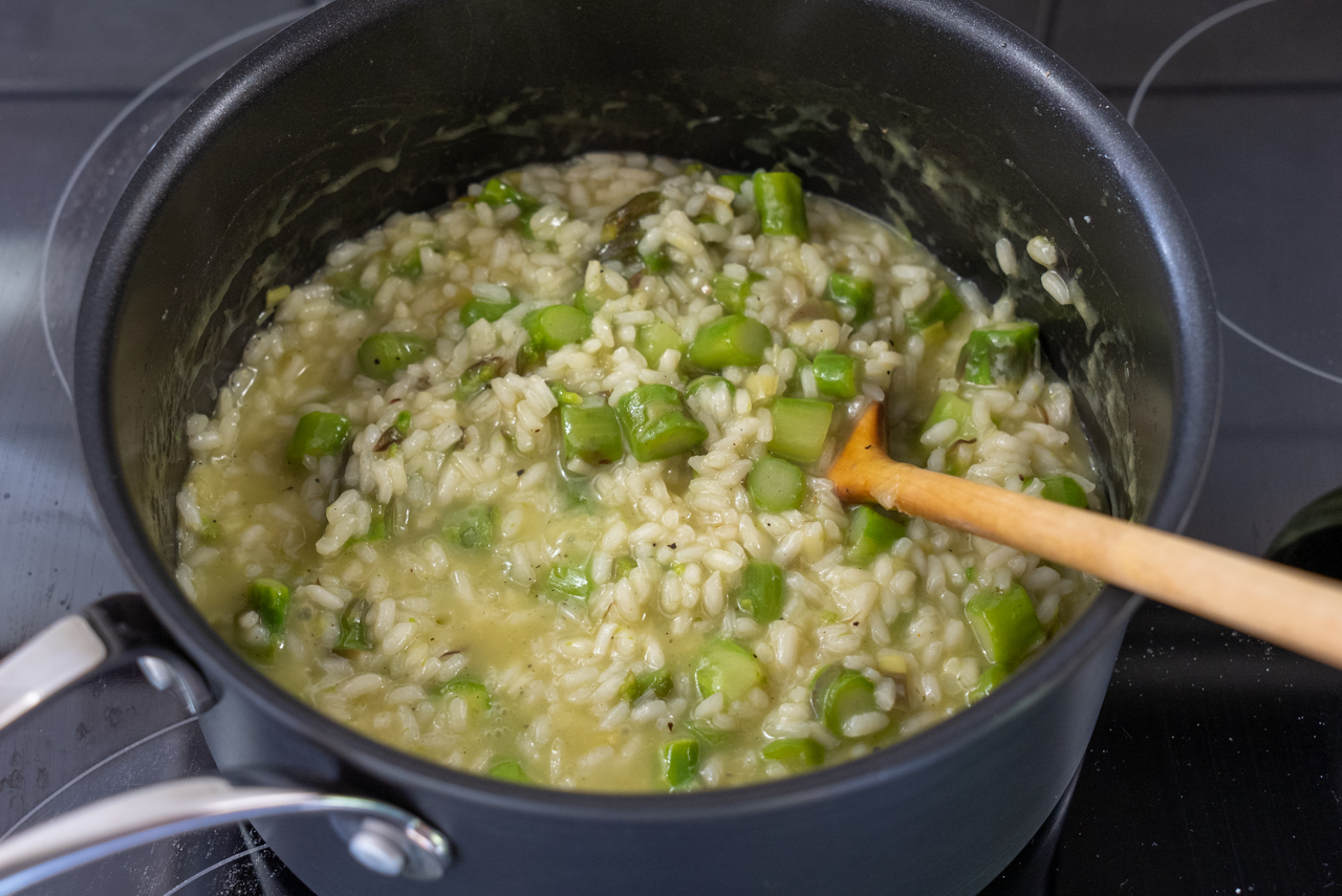 Mit ca. 100 ml Weißwein ablöschen und einkochen lassen. Wenn die Flüssigkeit verdampft ist, soviel Spargelbrühe angießen, dass der Reis gut bedeckt ist. Unter Rühren einkochen lassen. Diesen Vorgang wiederholen, bis die Flüssigkeit aufgebraucht und der Reis weich und cremig ist. Das dauert je nach Reis ca. 15 Minuten.