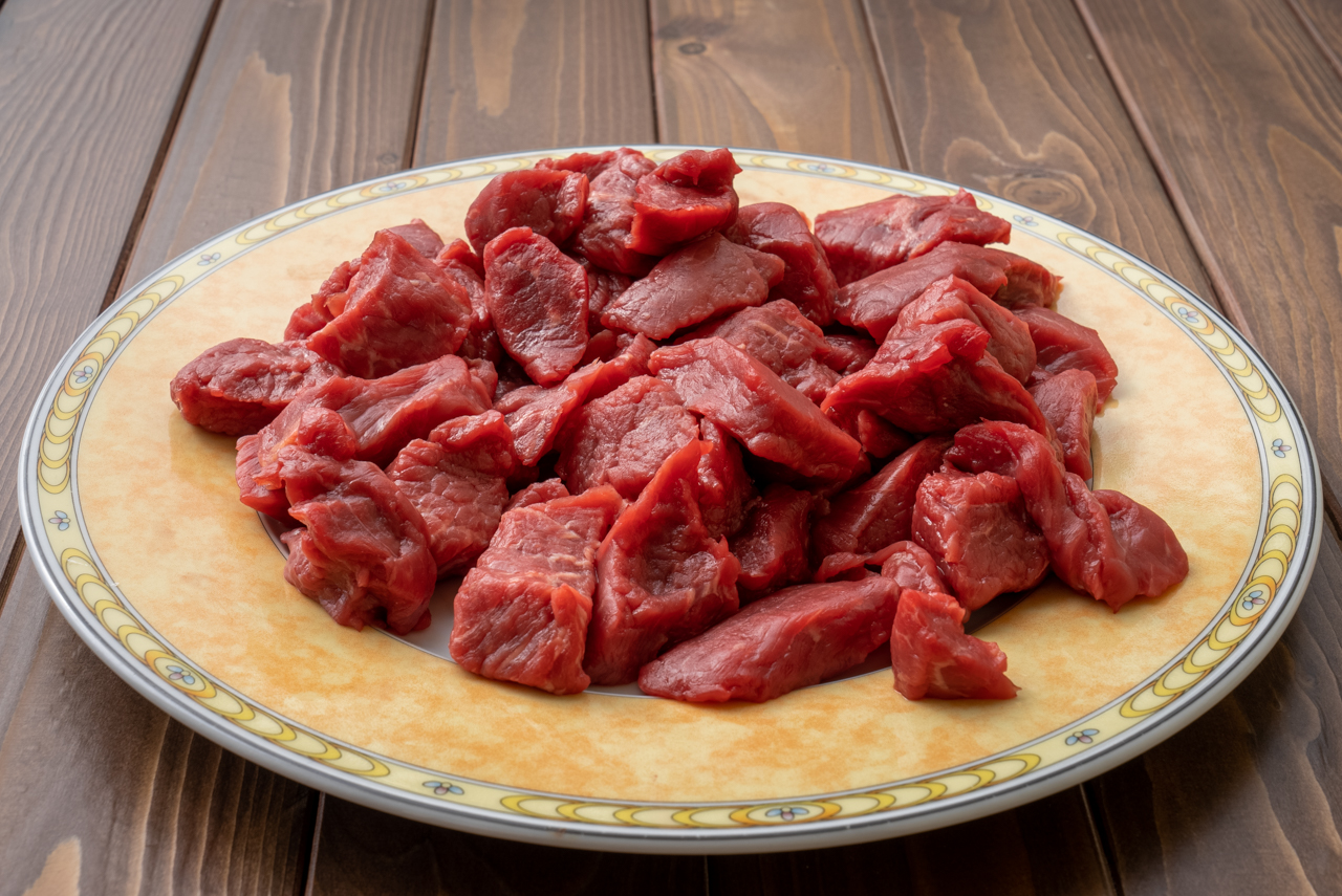 1 kg Rindfleisch (aus der Keule) in ca. 3 cm große Würfel schneiden und zu den Zwiebeln geben. Bei mittlerer Hitze 5 Minuten von allen Seiten anbraten. Mit Salz und 1 TL Kümmel würzen.