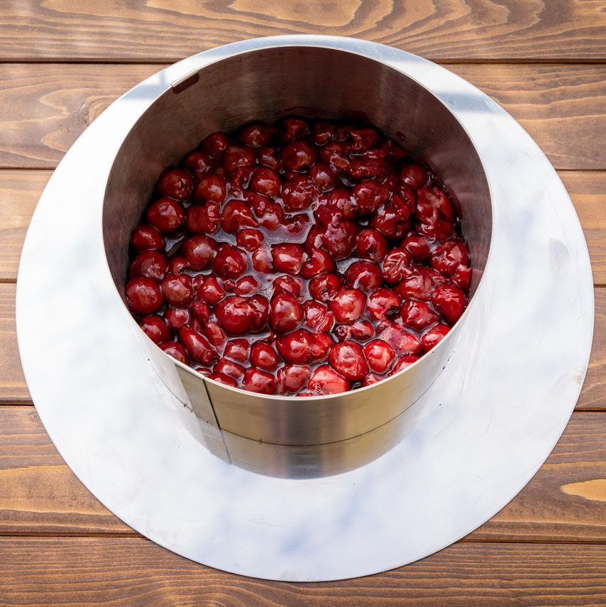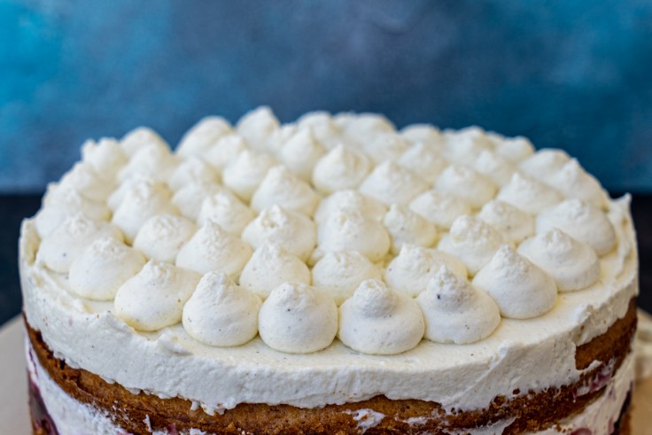 Die Torte aus dem Ring lösen und entweder „naked“ (also ohne Cremerand) servieren oder den Rand mit ca. 2 EL Creme bestreichen. (Bei der Naked-Variante sollte man beim Schichten der Torte sehr ordentlich arbeiten und ggfs. Tortenradfolie benutzen.)