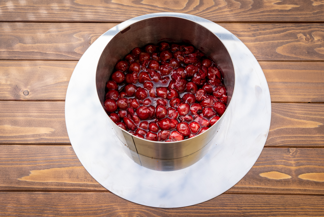 Zur Fertigstellung der Torte den Tortenring auf eine Platte stellen. Den Tortenboden horizontal halbieren und den unteren Teil in den Ring geben. Die lauwarme Fruchtmasse auf dem Boden verteilen. Im Kühlschrank vollständig erkalten lassen. Ein Drittel der Creme auf die Fruchtmasse streichen und mit dem oberen Tortenbodenteil bedecken. Das zweite Drittel der Creme darauf verteilen. Den Rest der Creme in einen Spritzbeutel füllen und als Tupfen auf der Oberfläche der Torte spritzen.
