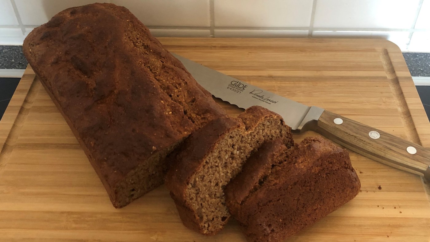 Teig in eine Kastenform füllen und im auf 180 Grad vorgeheizten Backofen ca. 45 Minuten backen.