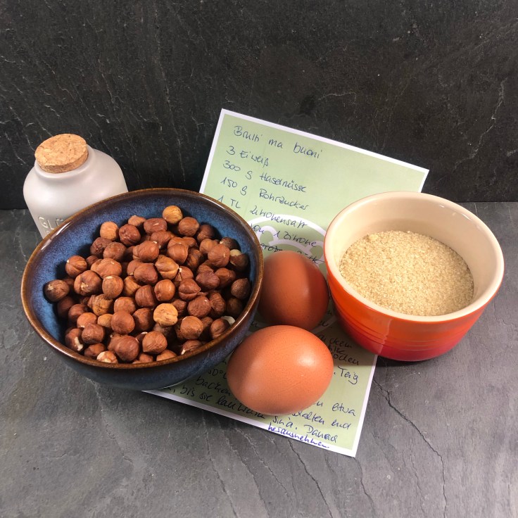 300 g Haselnüsse hacken und zusammen mit der abgeriebenen Schale von einer Zitrone esslöffelweise mit dem Kochlöffel unter den festen Eischnee heben.