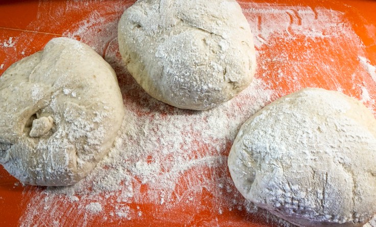 3 Teiglinge abstechen, zu straffen Zylindern vorformen und 30 Minuten mit Schluss nach oben im Leinentuch ruhen lassen.