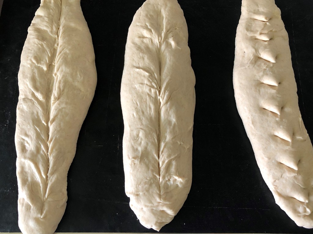 Die Teiglinge mit Schluss nach unten auf ein mit Backpapier ausgelegtes Backblech geben, der Länge nach mit einer scharfen (! – sonst sieht es aus wie bei mir, da war sie zu stumpf) Klinge einschneiden und im auf 250 Grad vorgeheizten Backofen ca. 20 Minuten mit Dampf backen, bis die Brote goldbraun sind.