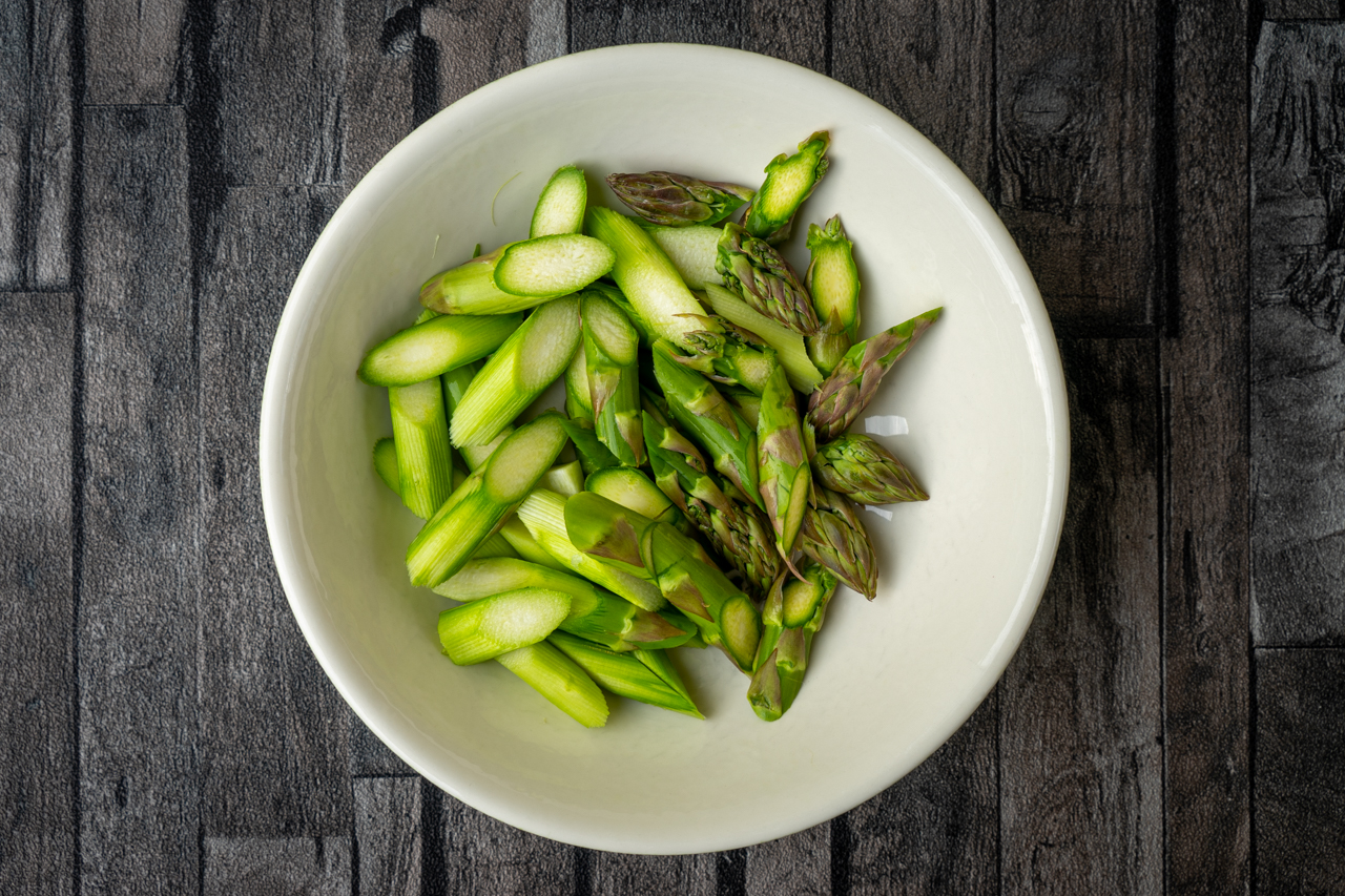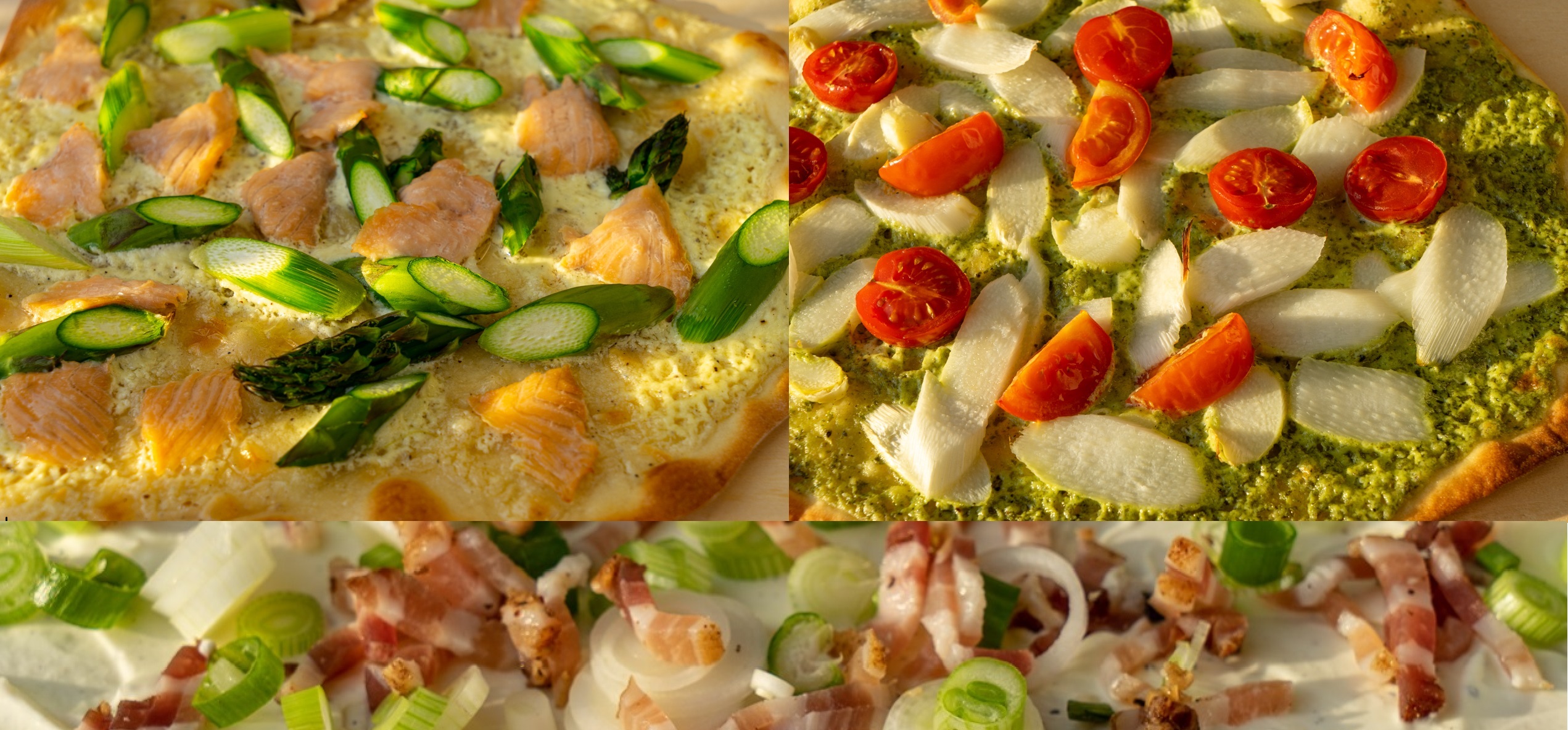 Für den Flammkuchen mit grünem Spargel 150 g Creme Fraîche, 1 Prise Salz und Pfeffer verrühren. Zwei Teige damit bestreichen. 250 g grünen Spargel schräg in dicke Scheiben schneiden und auf den Böden verteilen. 150 g Räucherlachs zupfen oder kleinschneiden, ebenfalls darauf geben.