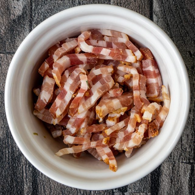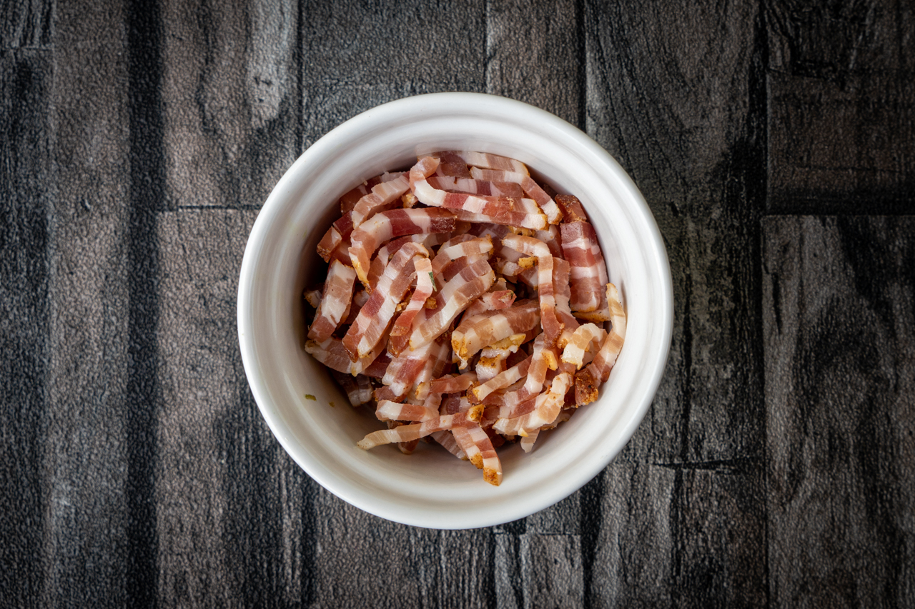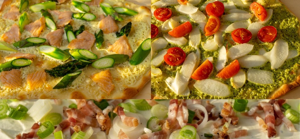 Weil wir heute so Lust auf klassischen Flammkuchen hatten, habe ich den Teig in 5 Teile geteilt und den letzten Flammkuchen klassisch belegt. Hierfür 75 g Creme Fraîche mit Salz und Pfeffer verrühren und auf dem Teig verteilen. 40 g Räucherspeck fein würfeln oder in dünne Streifen schneiden, 2 Frühlingszwiebeln in feine Ringe schneiden und beides auf dem Teig verteilen. Wie oben angegeben backen.