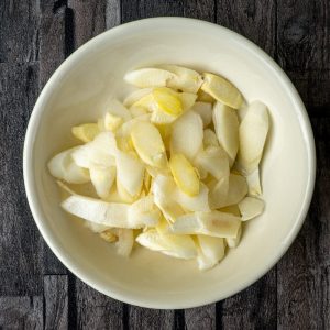 Für den Flammkuchen mit weißem Spargel 20 g Basilikumblätter, 150 g Creme Fraîche, Meersalz und Pfeffer pürieren und auf zwei Teige streichen. 250 g Spargel schälen, die Enden abschneiden, in feine Scheiben hobeln und auf dem Boden verteilen. 50 g Cocktailtomaten vierteln und ebenfalls darauf geben.