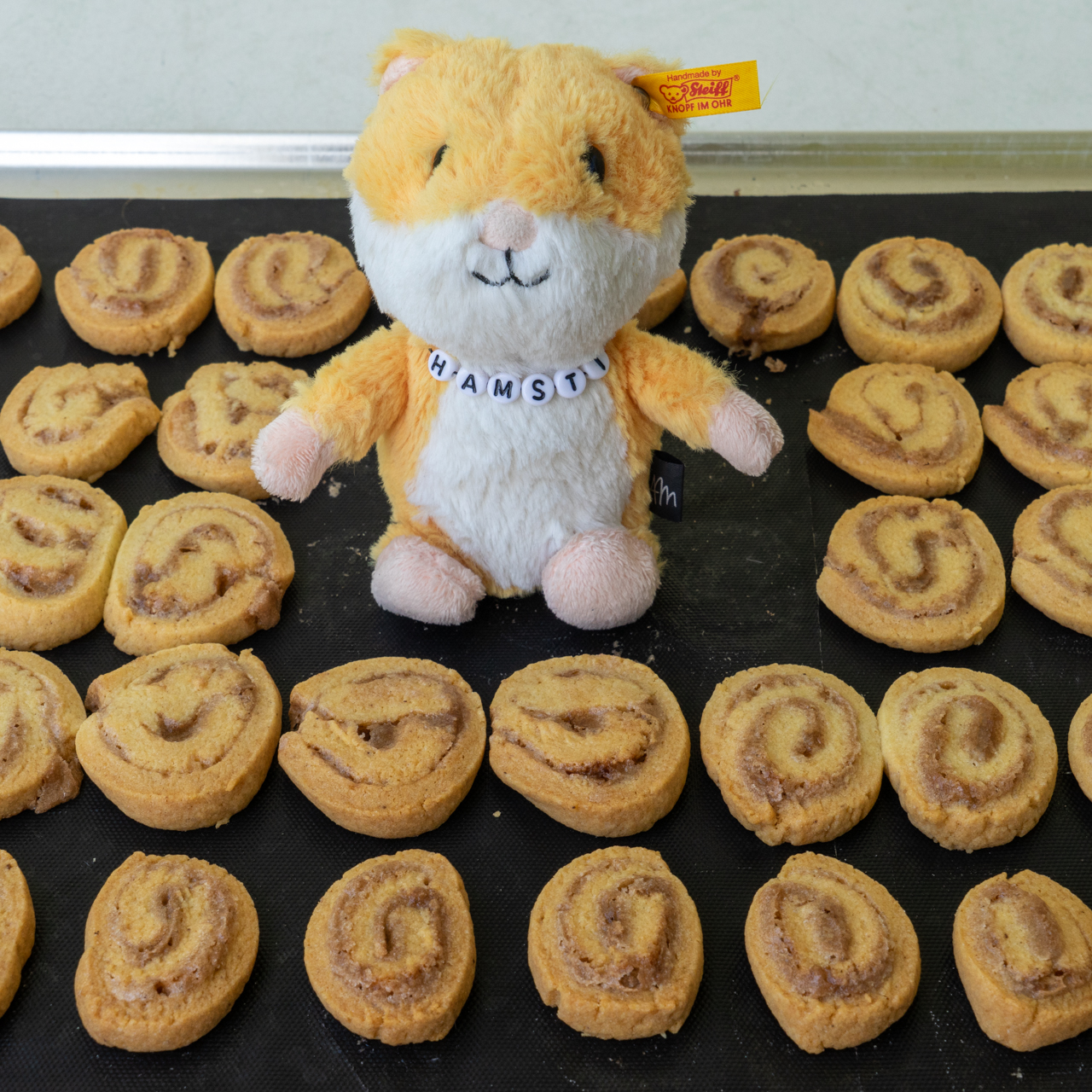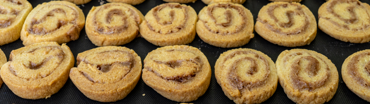 Die Rollen in ca. ½ cm breite Scheiben schneiden und mit etwas Abstand auf einem mit Backpapier ausgelegten Lochblech verteilen.