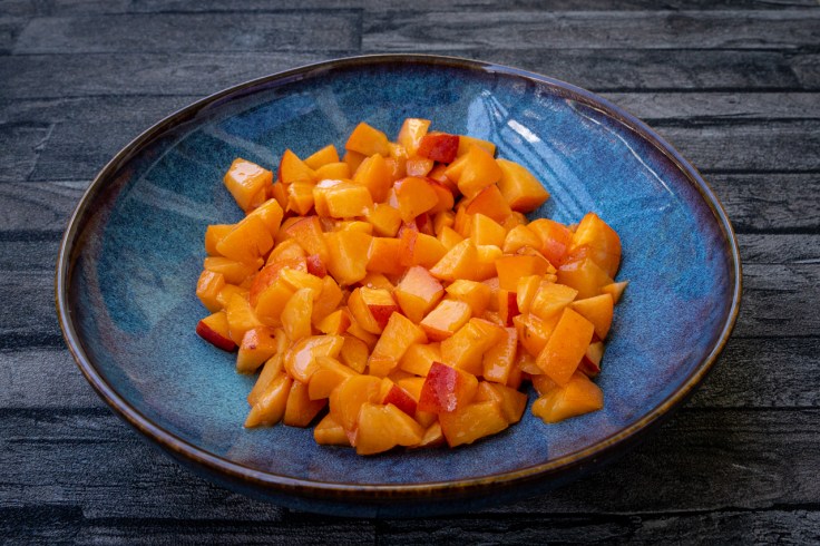 600 g frische Aprikosen halbieren, entsteinen und in Würfel schneiden. Mit etwas Zucker vermischen.
