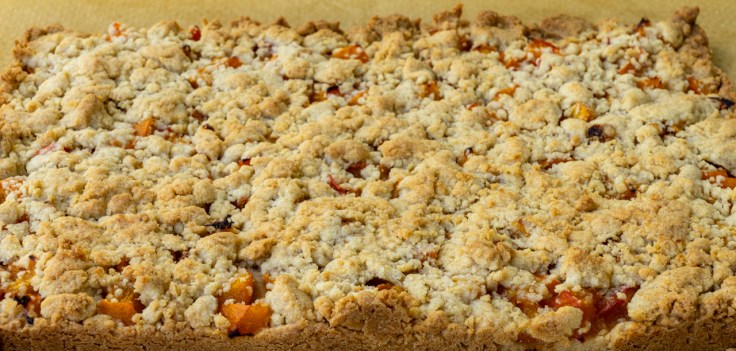 Die Aprikosen gleichmäßig auf dem Teig verteilen und die restlichen Streusel darüber geben.