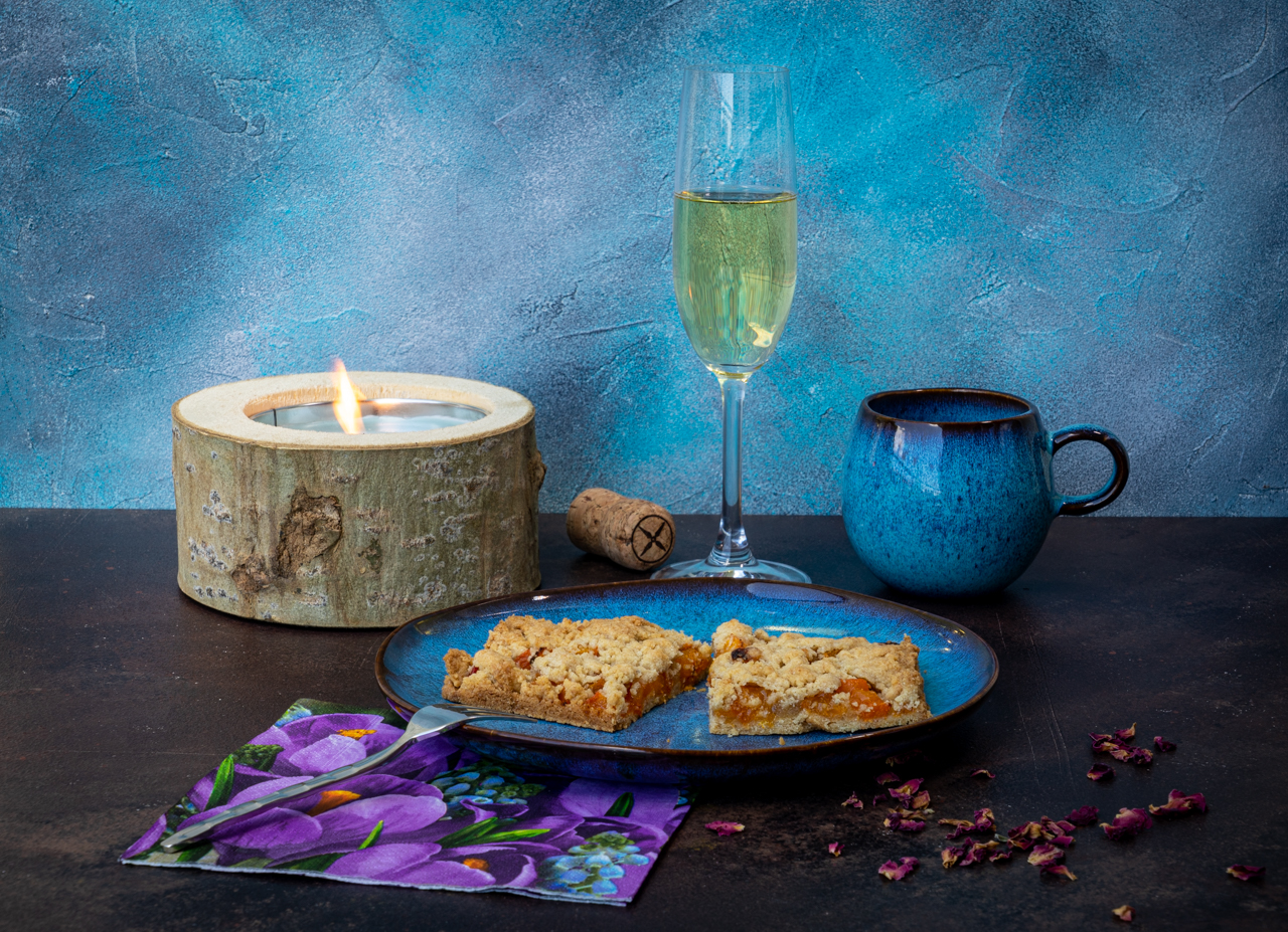 Die Aprikosen gleichmäßig auf dem Teig verteilen und die restlichen Streusel darüber geben.