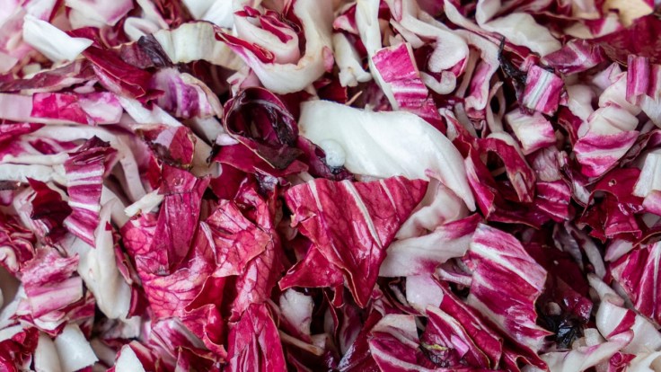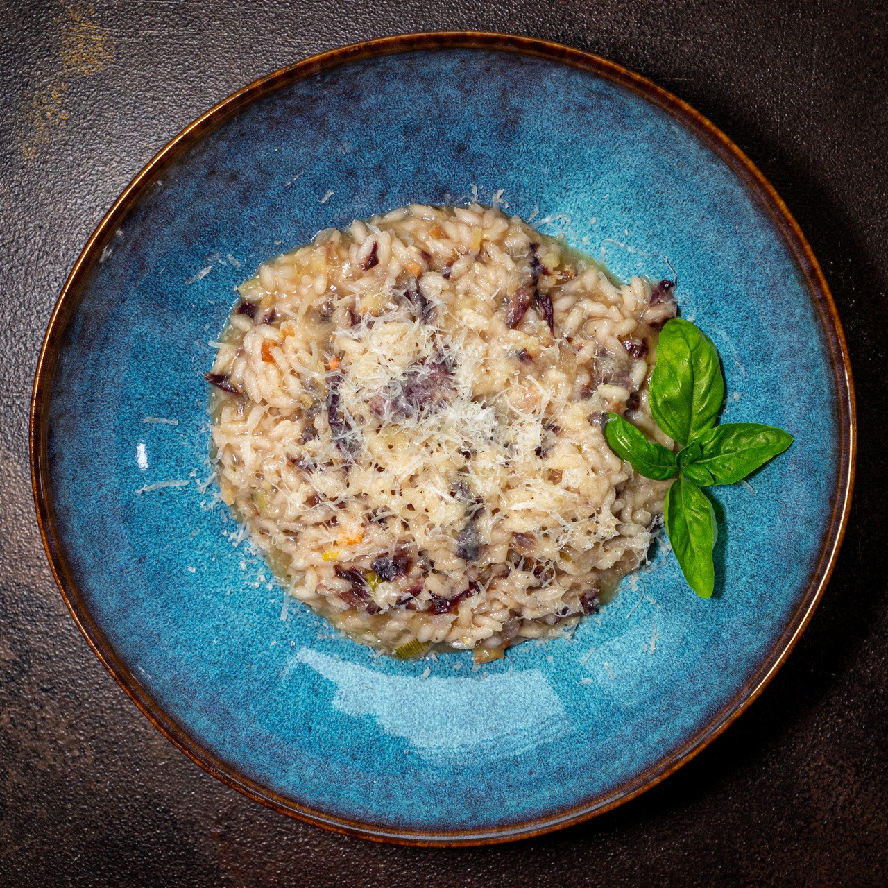 150 g Risottoreis (Arborio oder Vialone) hinzufügen und glasig dünsten. Mit 100 ml Weißwein ablöschen und Radicchio zufügen.