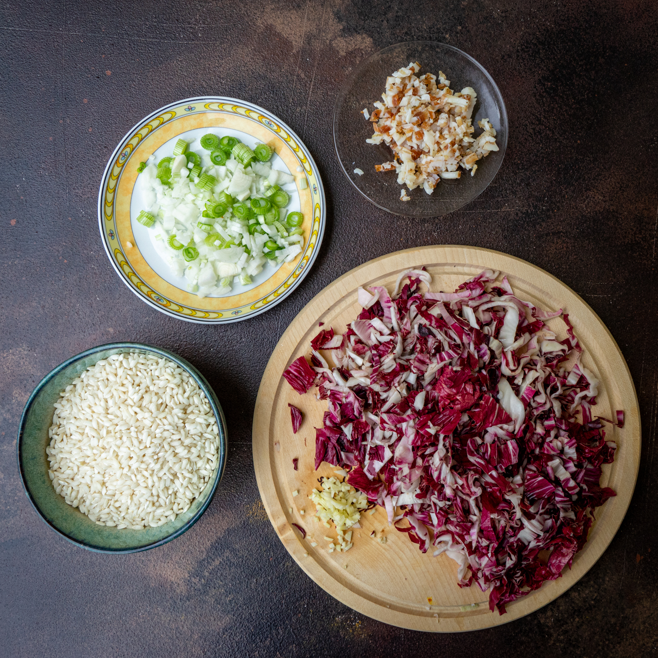 2 Frühlingszwiebeln, 1 Knoblauchzehe und 30 g durchwachsenen Speck (Wammerl) in feine Würfel, 1 kleinen Kopf Radicchio in dünne Streifen schneiden. Gut 500 ml Gemüsebrühe kochen. 30 g Parmesan reiben.