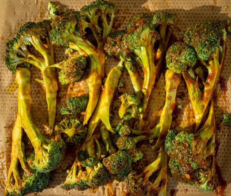 Im Backofen ca. 15 Minuten backen, bis der Broccoli anfängt zu bräunen. Einmal wenden und nochmals 15 Minuten backen. Evtl. zum Ende der Backzeit den Grill zuschalten.