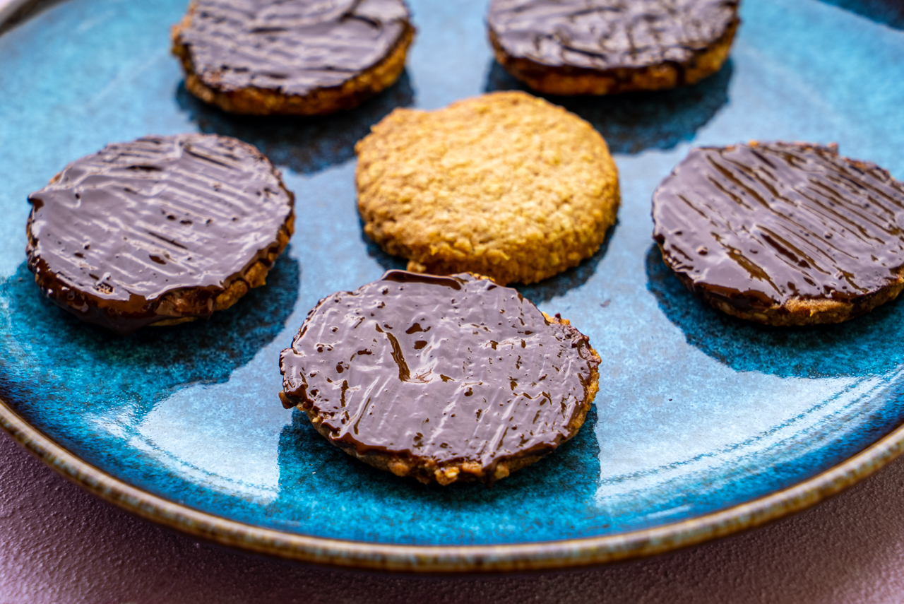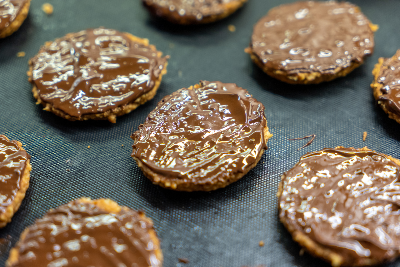 Nach Geschmack Vollmilch- oder Bitterschokolade im Wasserbad vorsichtig schmelzen lassen und einen Teil der Kekse von unten damit bestreichen. Wenn die Schokolade getrocknet ist, die Kekse in einer luftdichten Dose aufheben.