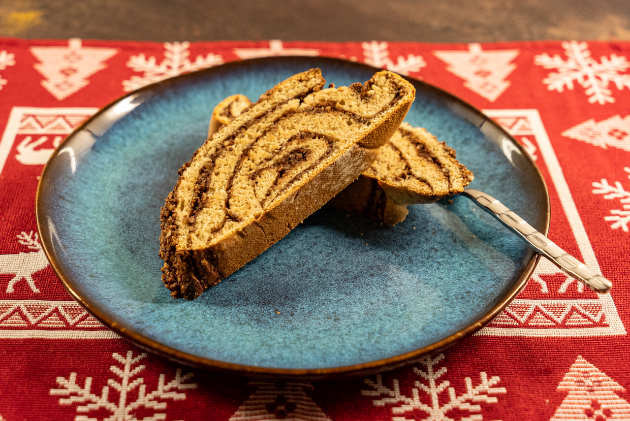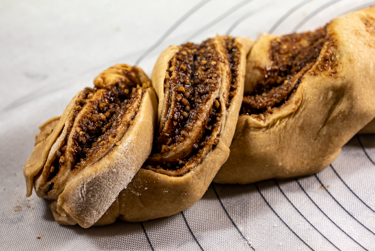 Den Teig auf einer bemehlten Fläche rechteckig ausrollen. Die Nussmasse mit einer Palette gleichmäßig auf dem Teig verteilen. Den Teig von einer Seite zu einer Rolle aufrollen. Die Rolle mit einem scharfen Messer von der Mitte her der Länge nach so aufschneiden, dass zwei Stränge entstehen. Zu einem Zopf verdrehen. Mit der anderen Hälfte der Teigrolle genauso verfahren (das ist einfacher als mit zwei langen Strängen).
