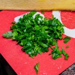 Nach Geschmack leicht andicken. Dafür 1-2 TL Stärke mit etwas kaltem Wasser oder Sahne klümpchenfrei verrühren und unter ständigem Rühren in die Soße rühren und aufkochen lassen. Zum Schluss 2 Stängel kleingehackte Petersilie unterrühren.