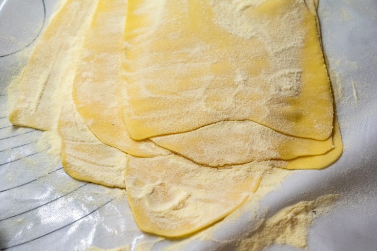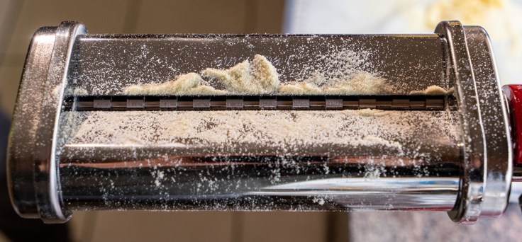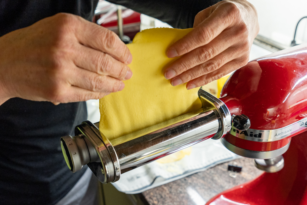 In 8 Stücke teilen. Jedes Teigstück auf Stufe 1 durch die Nudelmaschine geben, falten, nochmals durchlaufen lassen. Den Vorgang wiederholen, bis der Teig nicht mehr klebt. Nun auf immer dünner werdender Stufe (max. Stufe 5) wiederholt durch die Maschine laufen lassen.