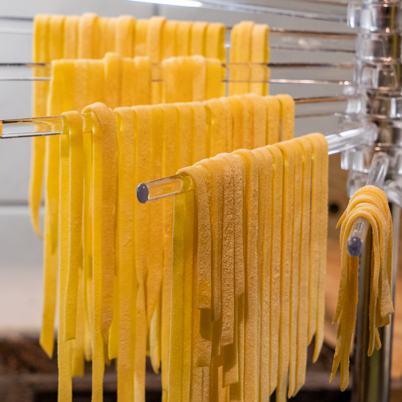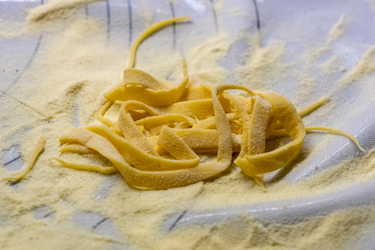 Teigplatten gut bemehlen und aufeinander schichten. Wenn der Teig komplett verarbeitet ist, den entsprechenden Aufsatz anschrauben und die Blätter nacheinander schneiden und auf einen Ständer hängen oder auf ein bemehltes Küchentuch legen und mit Mehl bestreuen, damit die Nudeln nicht zusammenkleben. (Man kann die Blätter auch von Hand kleinschneiden)