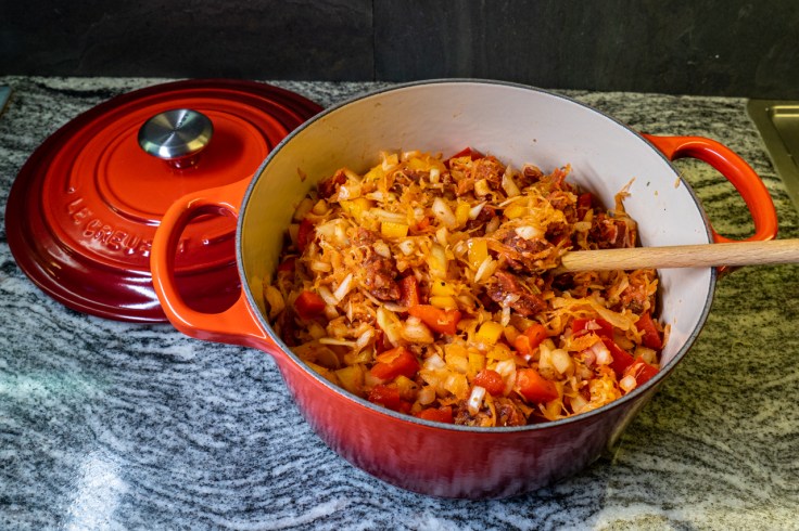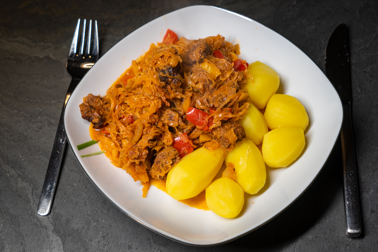 1 Gemüsezwiebel schälen und fein würfeln. 1 rote und 1 gelbe Paprikaschote putzen und in ca. 1 cm große Würfel schneiden. 1 Dose Sauerkraut (ca. 500 g) in ein Sieb gießen und abspülen. Alles mit 800 g gemischtem Gulasch (Schwein/Rind) in einer großen Schüssel vermischen. Mit 2 TL edelsüßem und 2 TL scharfem Paprikapulver, 2 TL gemahlenem Kümmel, 2 TL Salz, Pfeffer und 2 TL Oregano würzen.