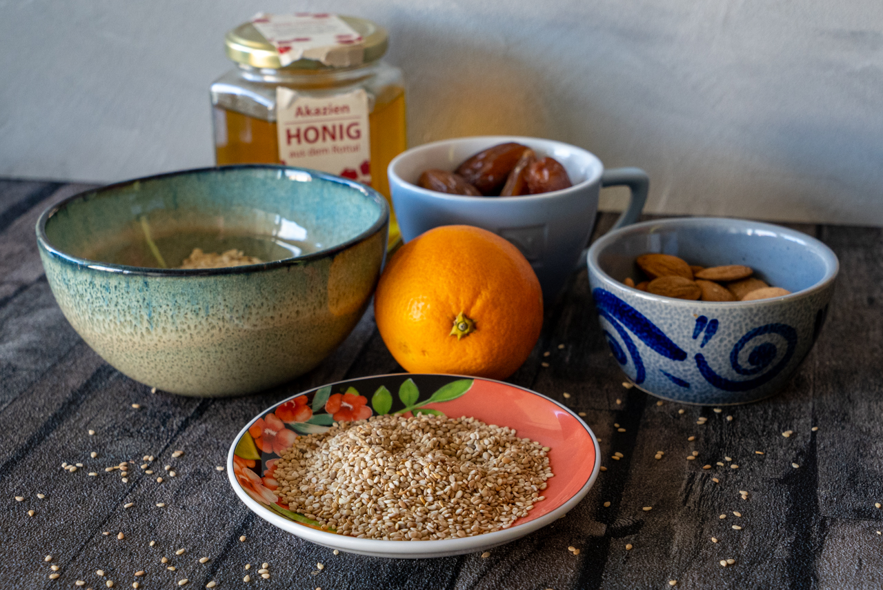 50 g Mandeln und 75 g entsteinte, getrocknete Datteln zusammen im Blitzhacker fein zerkleinern, dabei evtl. noch 1 EL Orangensaft zugeben.