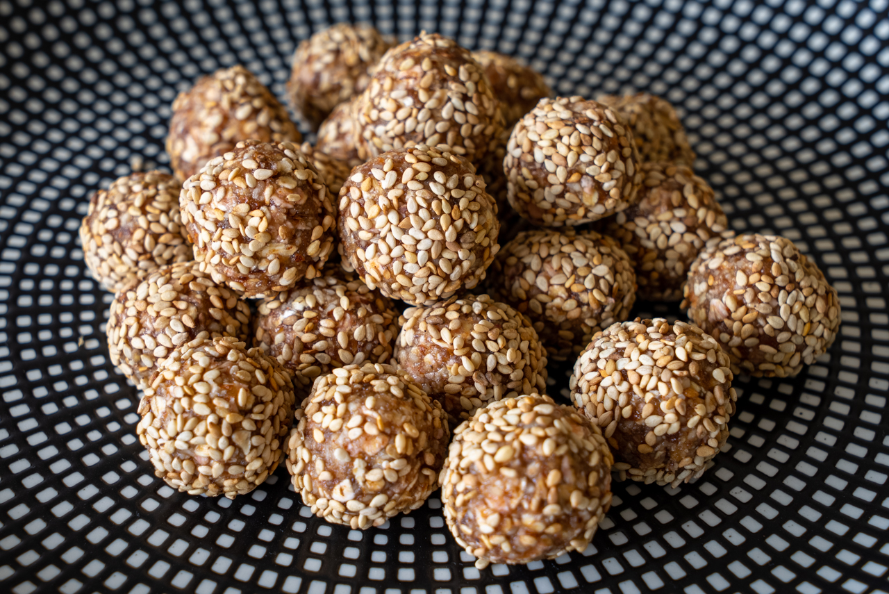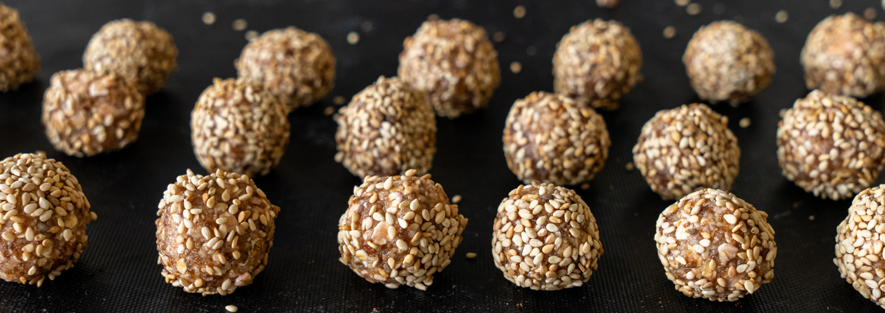 Aus der Dattel-Mischung 28 etwa gleich große Kugeln formen und nacheinander im gerösteten Sesam wälzen.