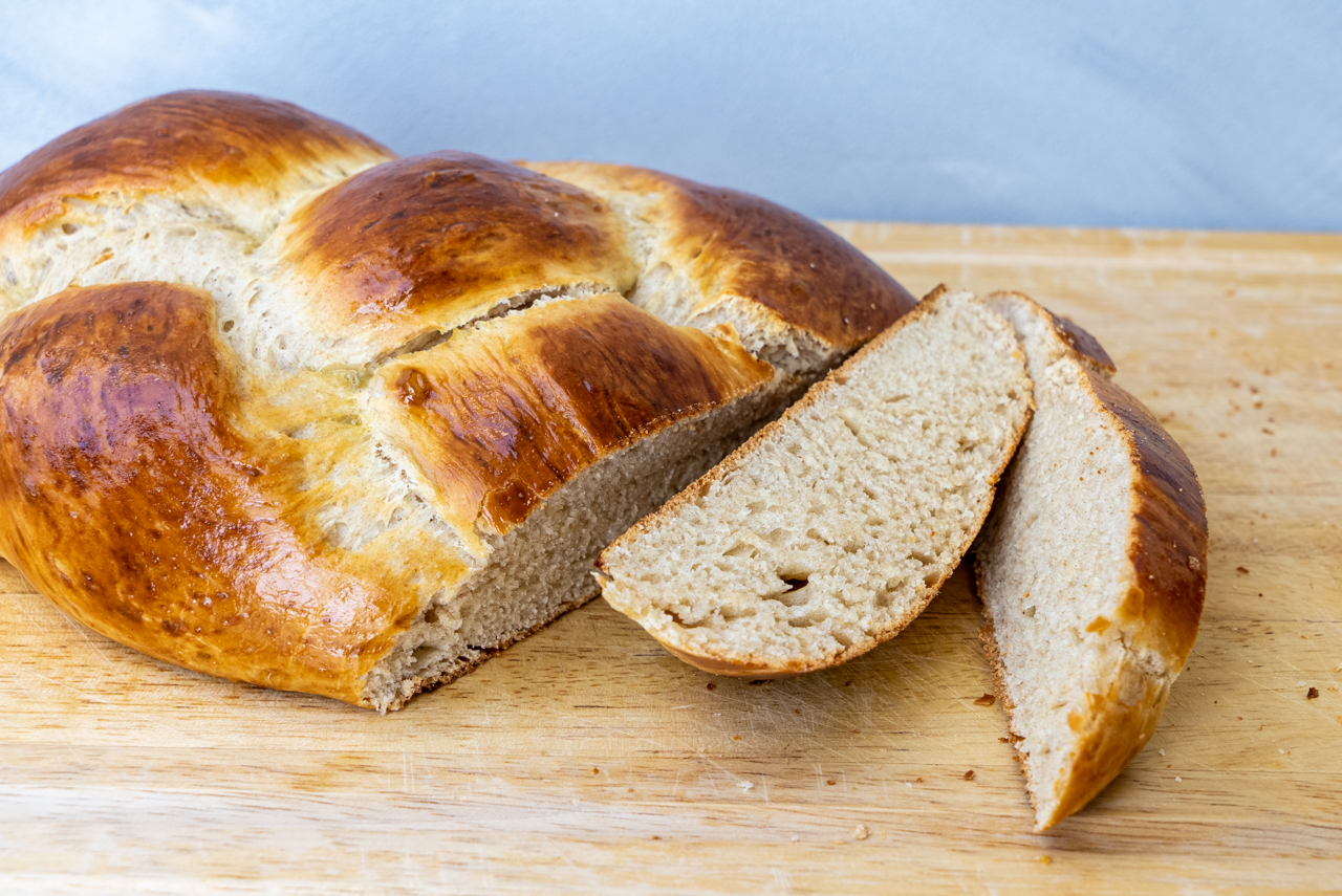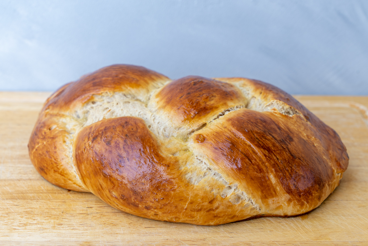 Ca. 30 cm lange Stränge formen und gut bemehlt zu zwei Zöpfen flechten. Das überschüssige Mehl abbürsten und die Zöpfe auf Backpapier mit verquirltem Ei einstreichen.