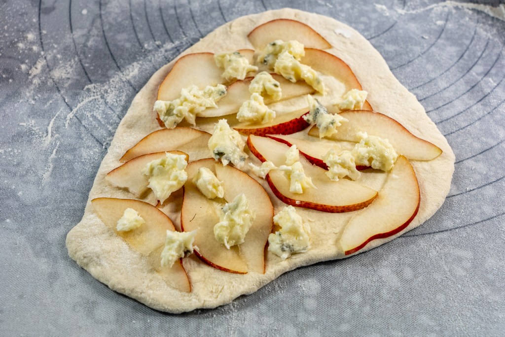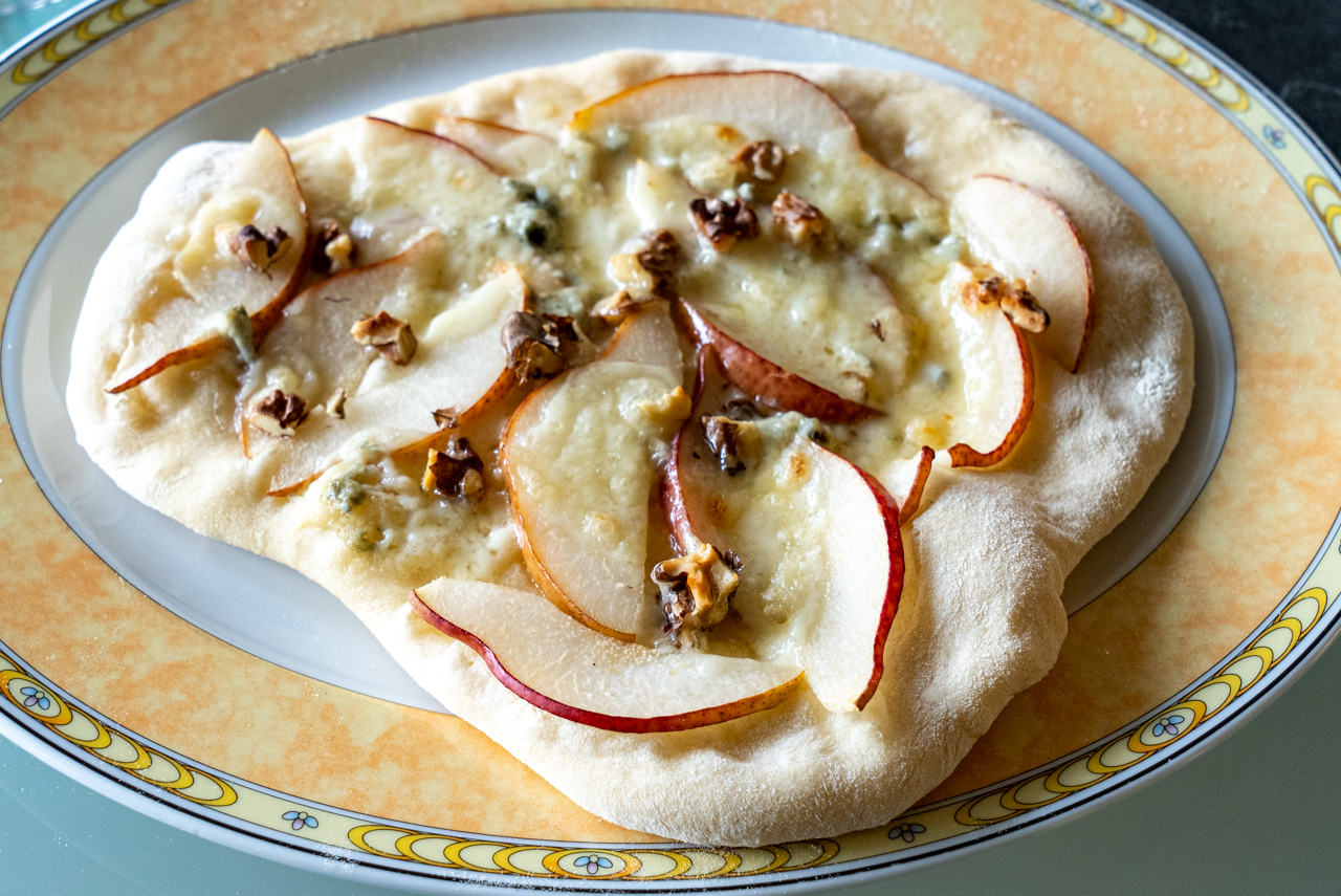 5 g frische Hefe (eher weniger!) in 300 ml kaltem Wasser auflösen. Mit 500 g Mehl (Typ 00) und 5 g Salz in der Küchenmaschine zu einem geschmeidigen Teig verkneten (ca. 10-15 Minuten), in einer mit Teller verschlossenen Schüssel 12 h ruhen/gehen lassen. Teig vor dem Belegen kurz kneten und nochmal 15 Minuten gehen lassen.