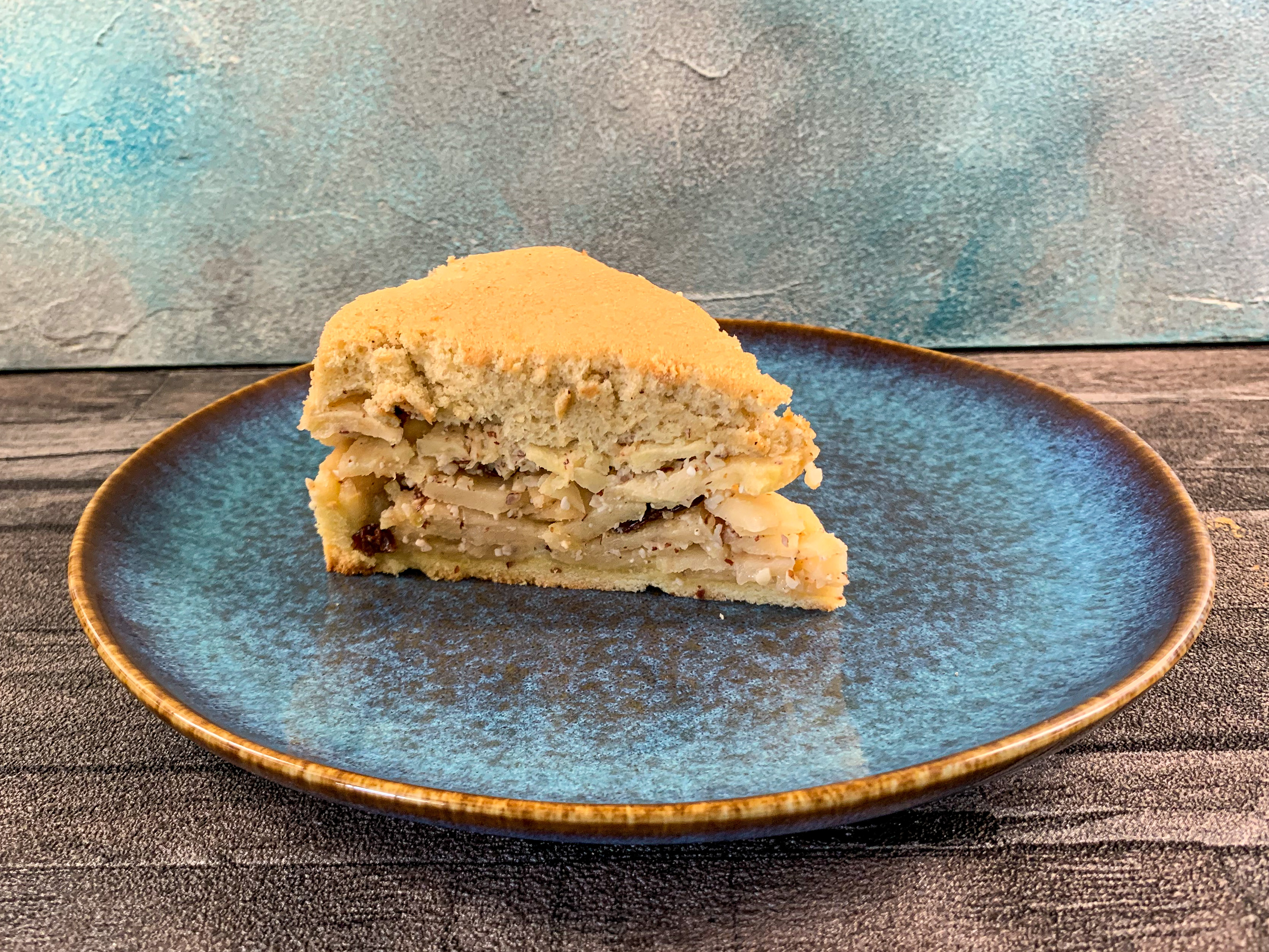 Währenddessen 1.250 g Äpfel schälen, vierteln, Kerngehäuse entfernen und in dünne Scheiben schneiden. In einer Schüssel mit 50 g Rosinen, Saft und abgeriebene Schale von 1 Zitrone, 1 Teelöffel geriebenem Ingwer, 75 g gehackten Haselnüssen und 1 TL Zimt mischen.