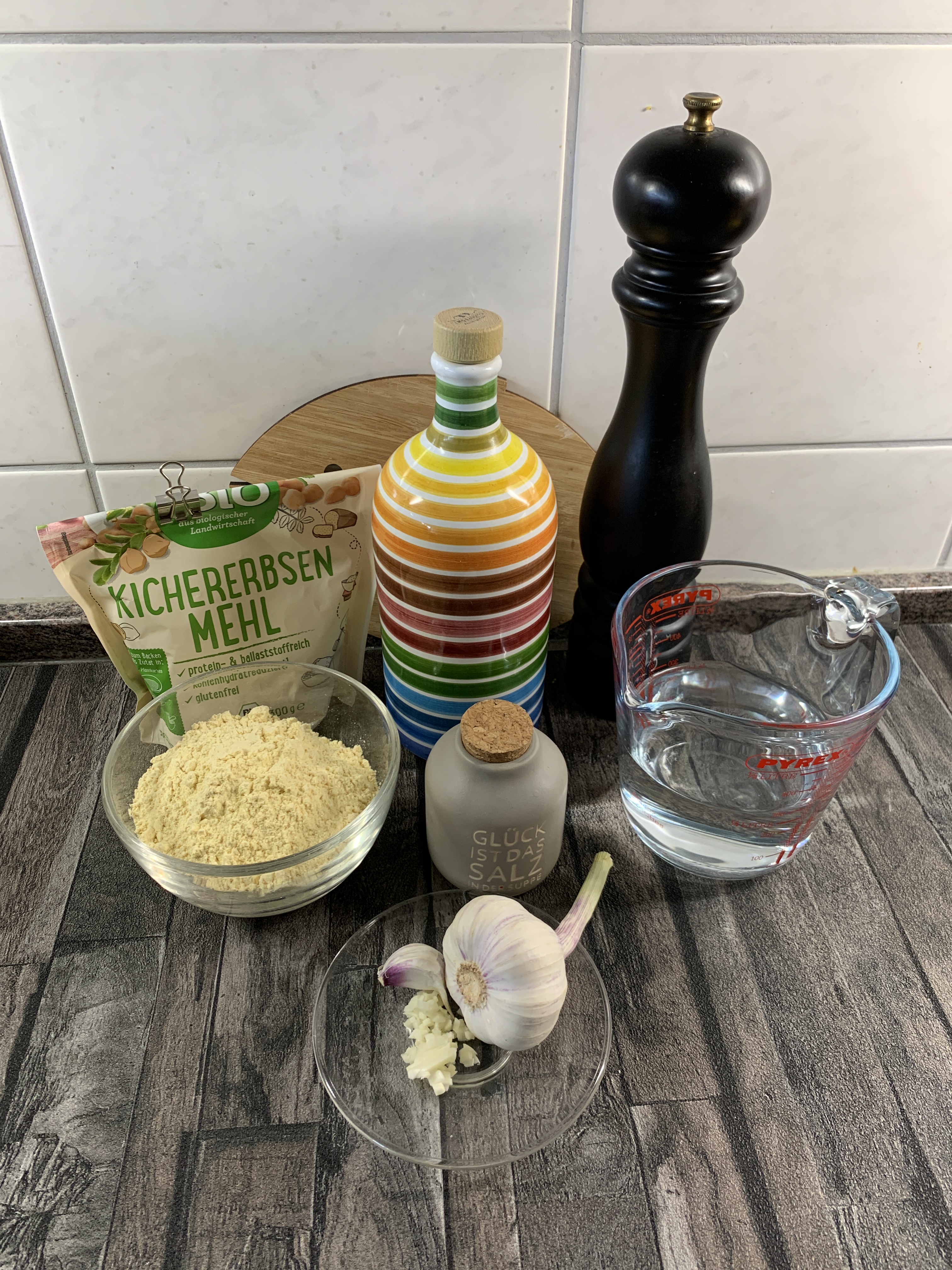 150 g Kichererbsenmehl, 300 ml Wasser, 30 ml Olivenöl, Salz, schwarzer Pfeffer aus der Mühle und 1 fein gehackte Knoblauchzehe gut verrühren und mindestens 2 Stunden quellen lassen.