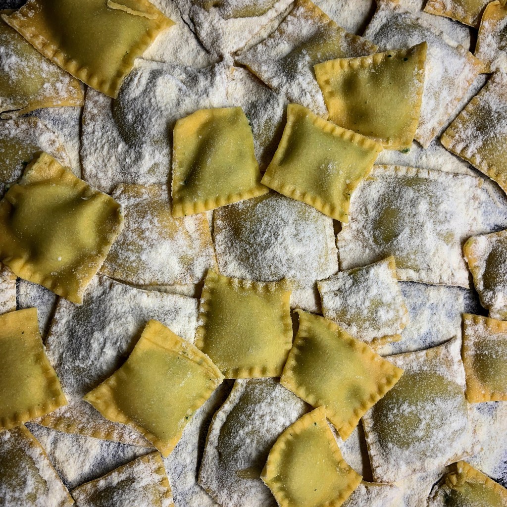 Den Nudelteig zu Platten ausrollen. Die Füllung in Tupfen aufspritzen. Die Zwischenräume mit Wasser bestreichen, mit einer weiteren Teigplatte bedecken. Teigränder andrücken und dabei die Luft herausstreichen. Mit der Teigrolle in einzelne Ravioli zerteilen. Die Ravioli mit Mehl bestreut bei Seite stellen, bis alle fertiggestellt sind.