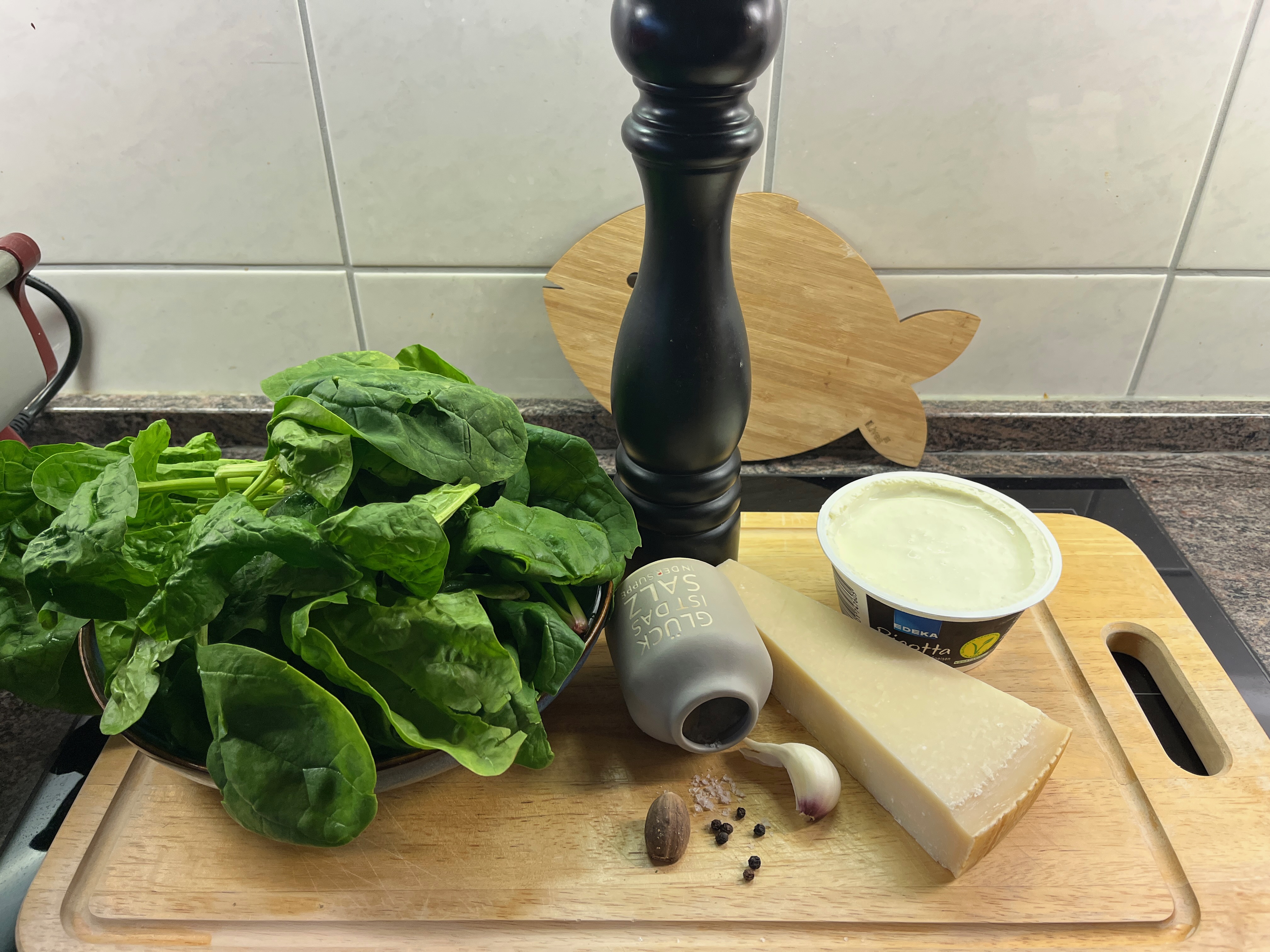 200 g Ricotta, 50 g frisch geriebenen Parmesan und 1 Eigelb vermischen. Mit Salz, Pfeffer und frisch geriebenem Muskat abschmecken, den abgekühlten Spinat unterrühren, nochmals abschmecken. Masse in einen Spritzbeutel füllen.