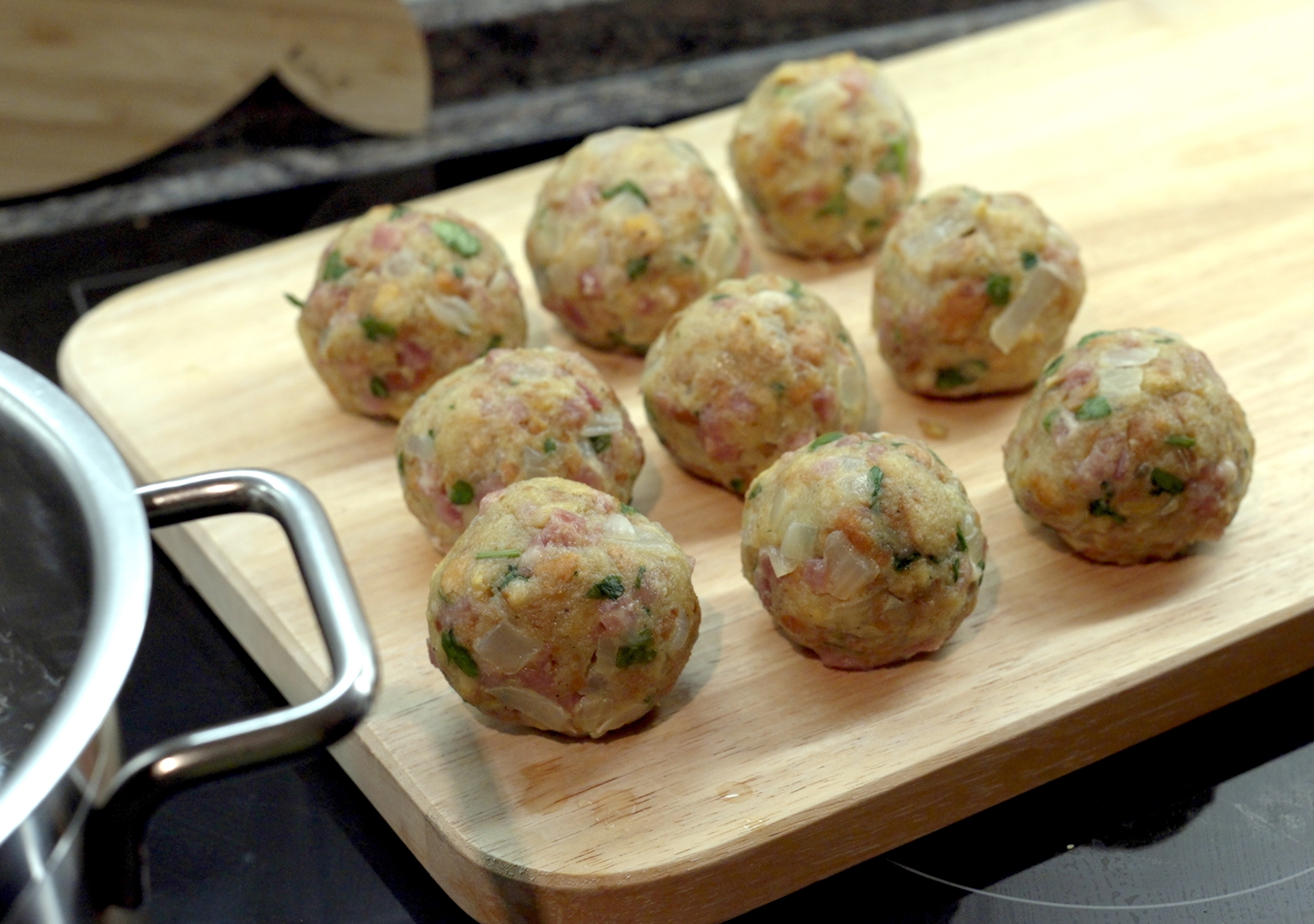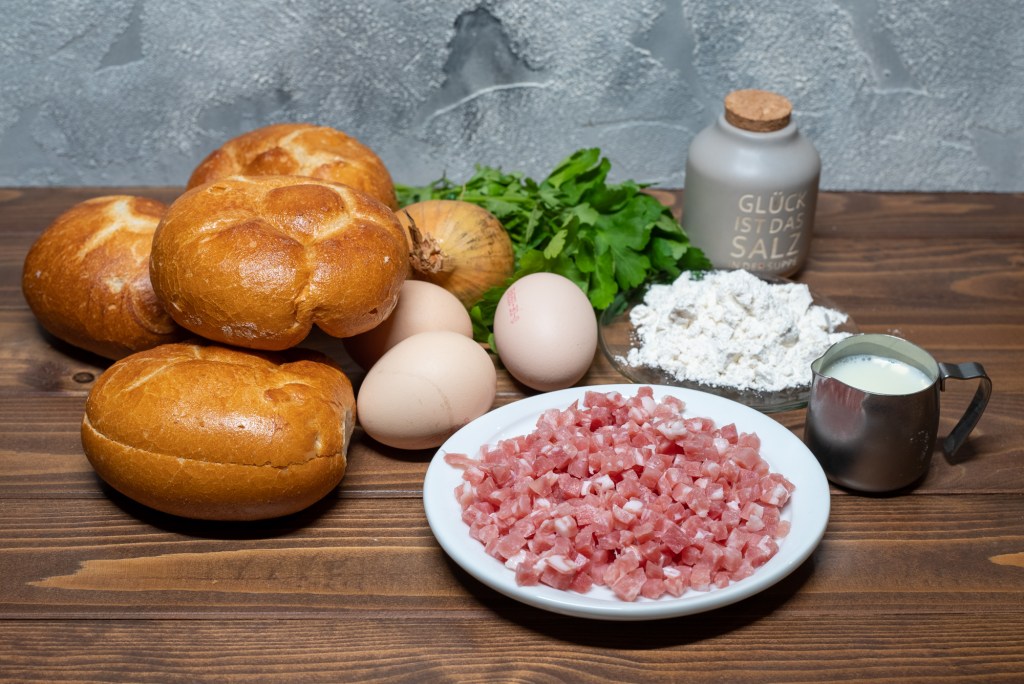 Alles in eine große Schüssel geben. 1 EL gehackte Petersilie, 40 g Mehl, 3 Eier und etwas Salz zugeben und zu einer homogenen, festen Masse verkneten. Hierbei soviel Milch zugeben, dass eine formbare aber nicht zu nasse Masse entsteht. Das ist nicht mehr, als eine Espressotasse voll und hängt davon ab, wie trocken das Weißbrot ist.