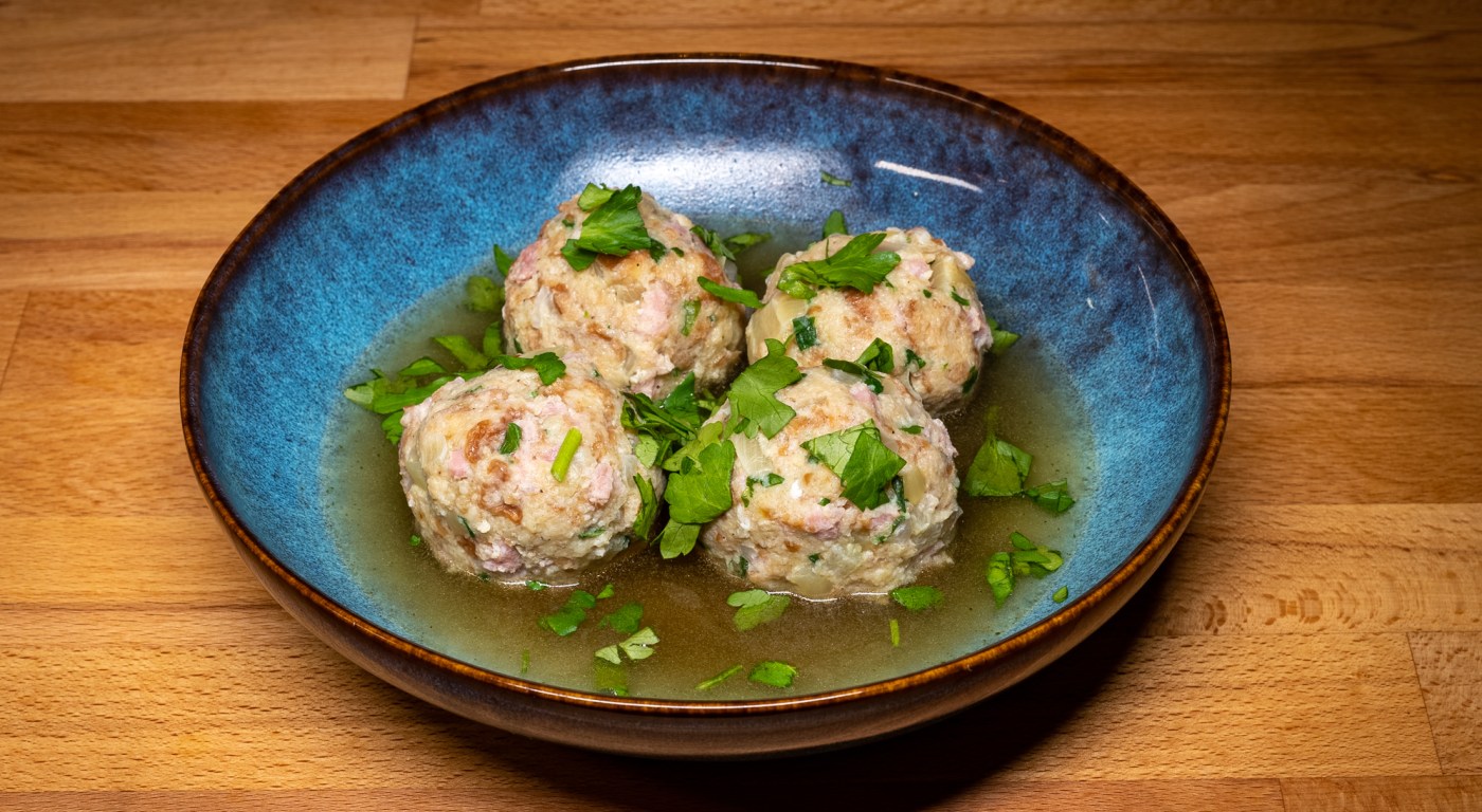 Die Knödel in Brühe und mit Schnittlauch bestreut servieren.