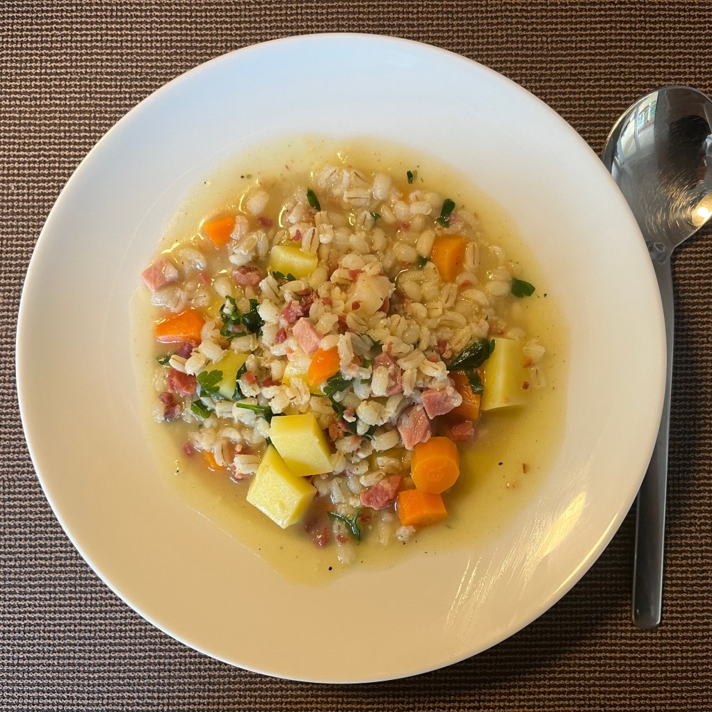 150 g Gerstengraupen kurz mit kaltem Wasser abspülen und zufügen, kurz mit anschwitzen.