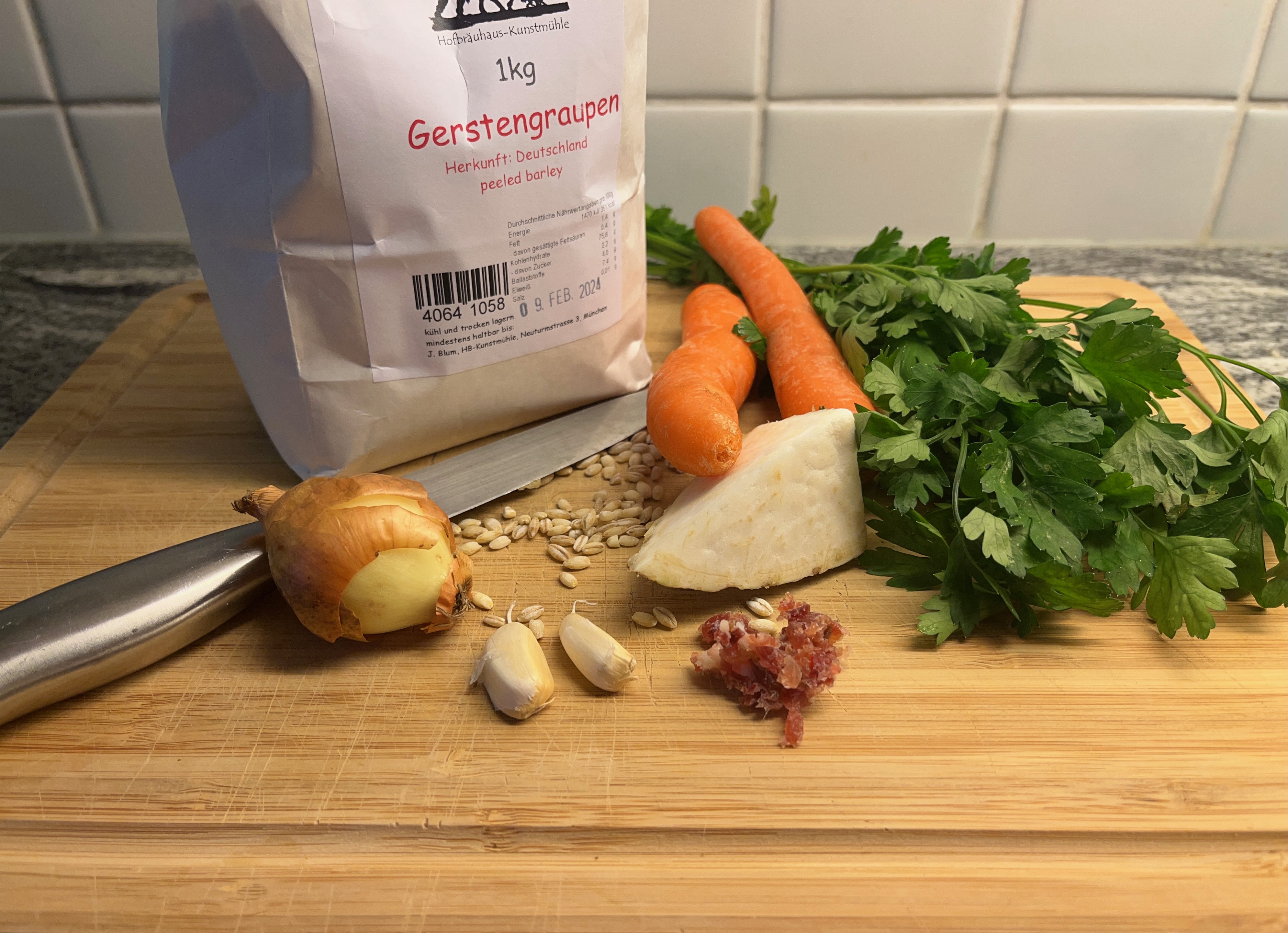 150 g Gerstengraupen kurz mit kaltem Wasser abspülen und zufügen, kurz mit anschwitzen.