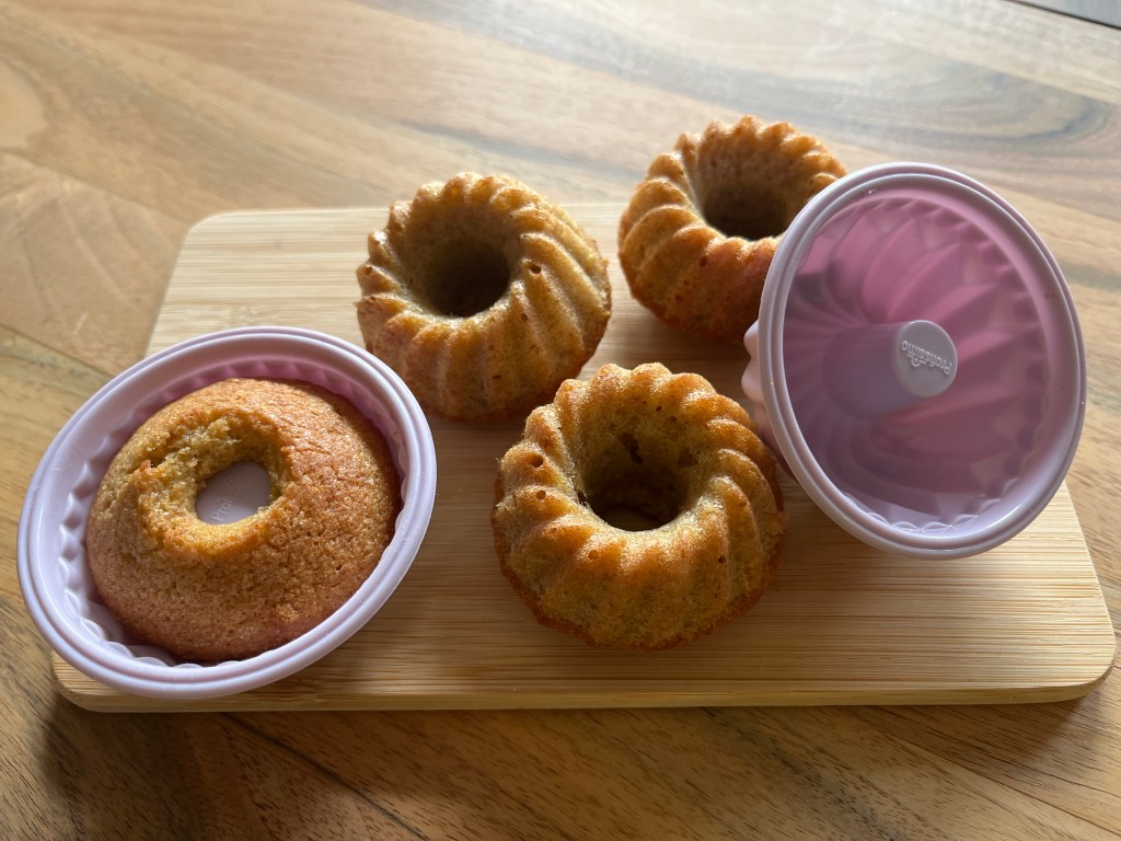 Den Teig auf 12 Mini-Gugelhupfformen verteilen (jeweils ca. 1 EL). Das geht am besten mit einem Spritzbeutel.